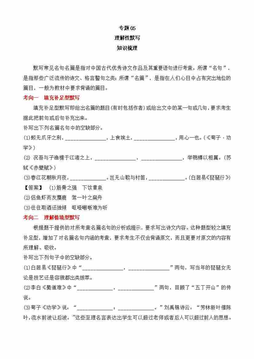期中专题05 理解性默写(知识梳理)-高一语文下学期期中期(统编版必修下册)