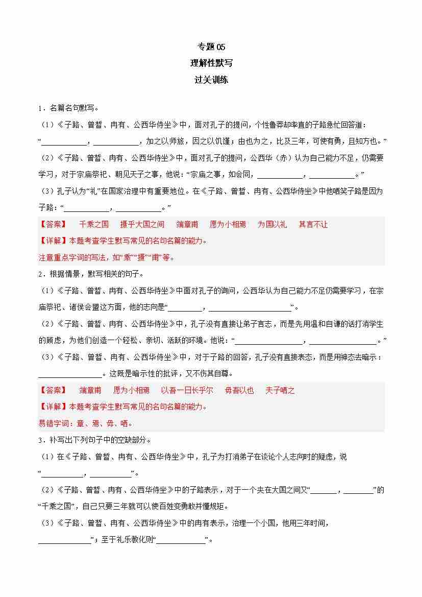 期中专题05 理解性默写(过关训练)-高一语文下学期期中期(统编版必修下册)教师版