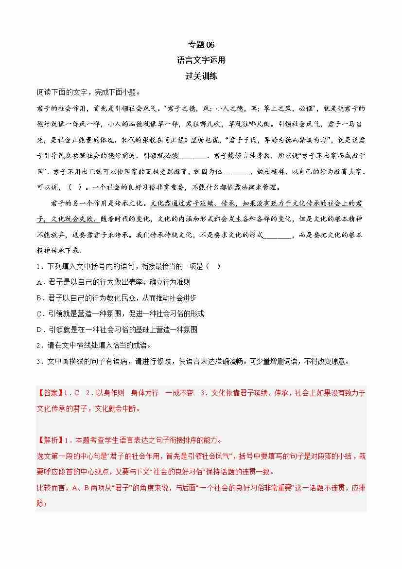 期中专题06 语言文字运用(过关训练)-高一语文下学期期中期(统编版必修下册)教师版