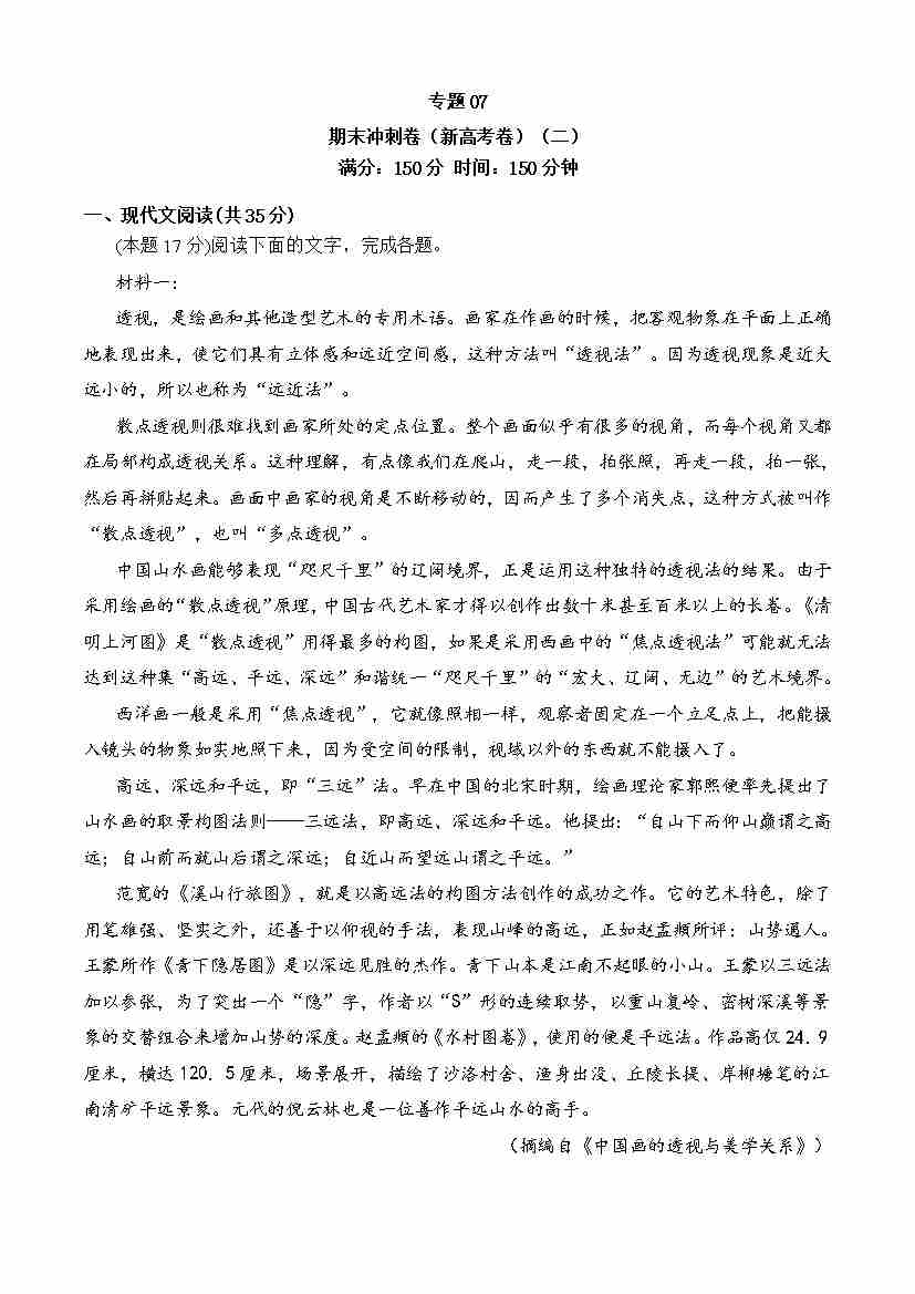 期中专题07 期中冲刺卷(新高考卷)(二)-高一语文下学期期中期(统编版必修下册)学生版