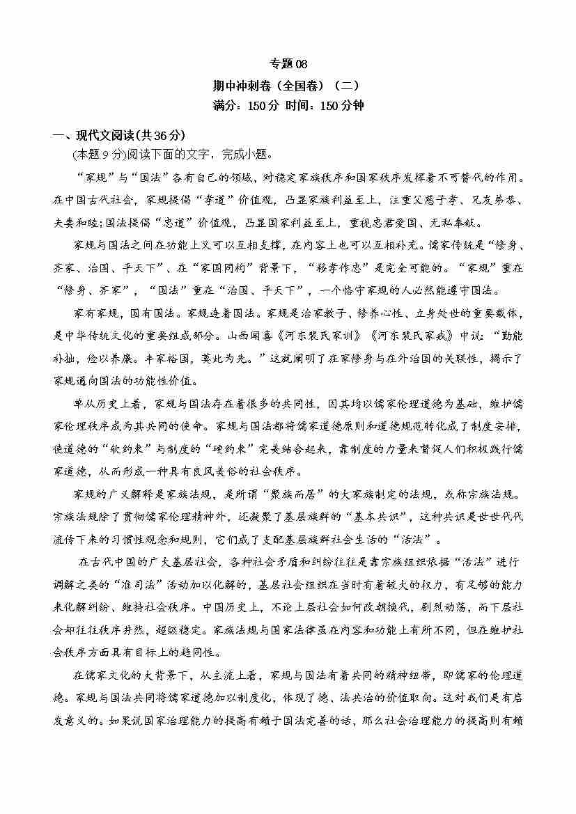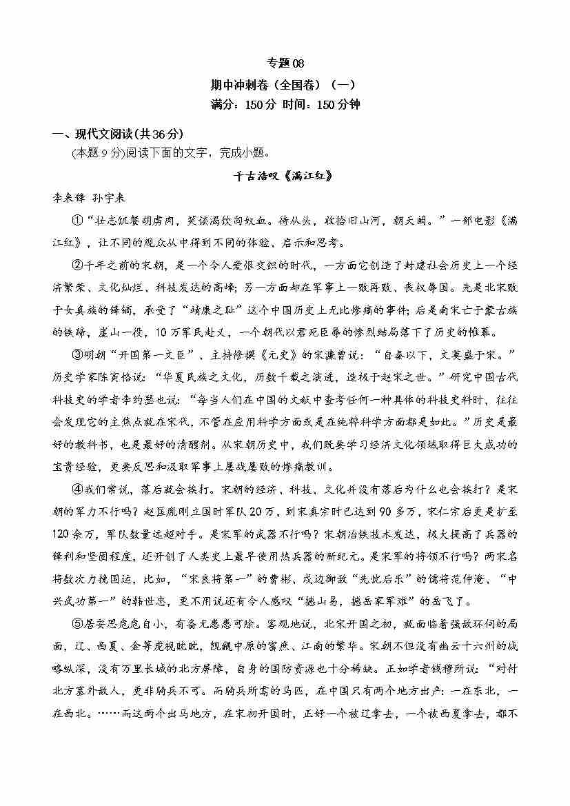 期中专题08 期中冲刺卷(全国卷)(二)-高一语文下学期期中期(统编版必修下册)学生版