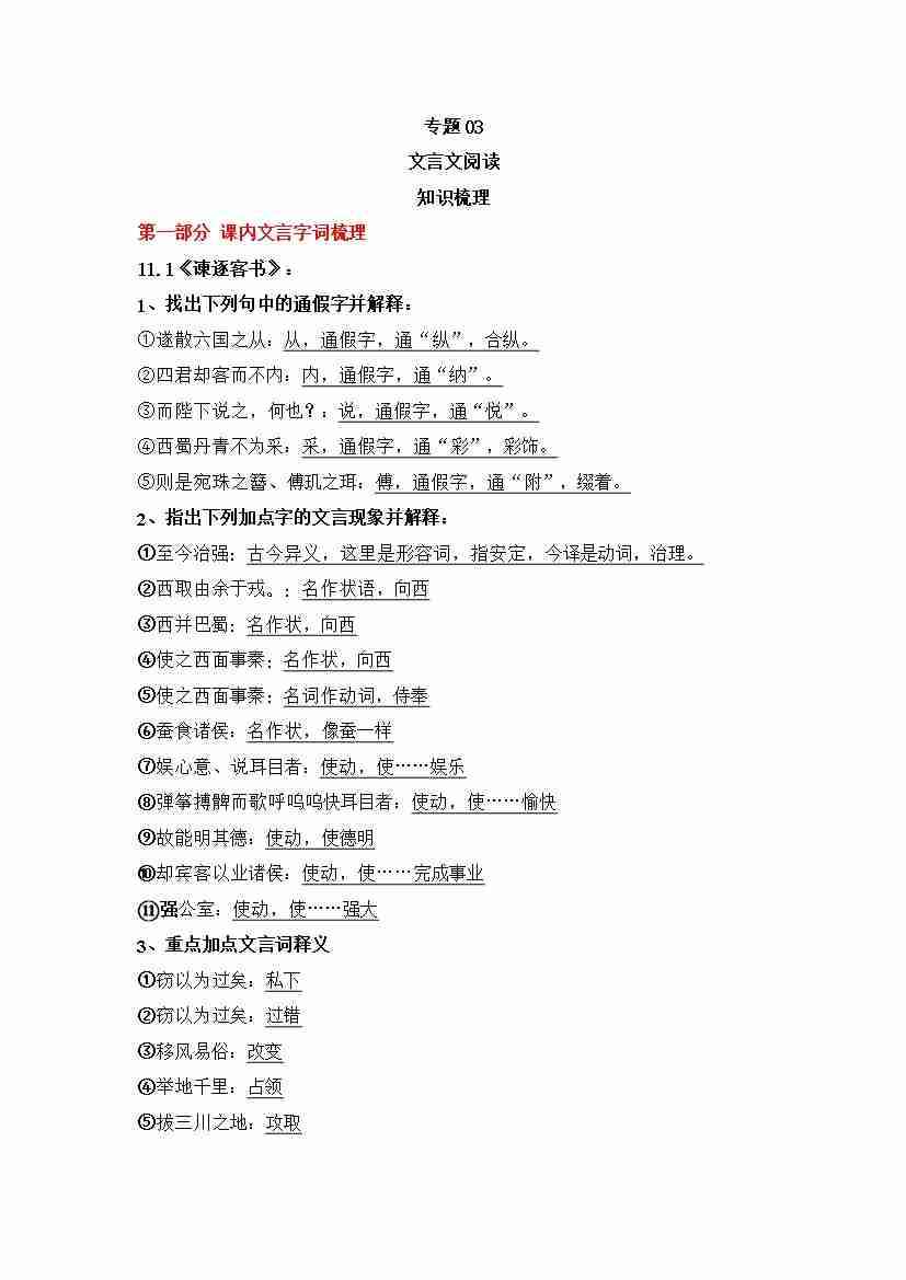 期末专题03 文言文阅读(知识梳理)-高一语文下学期期中期(统编版必修下册)