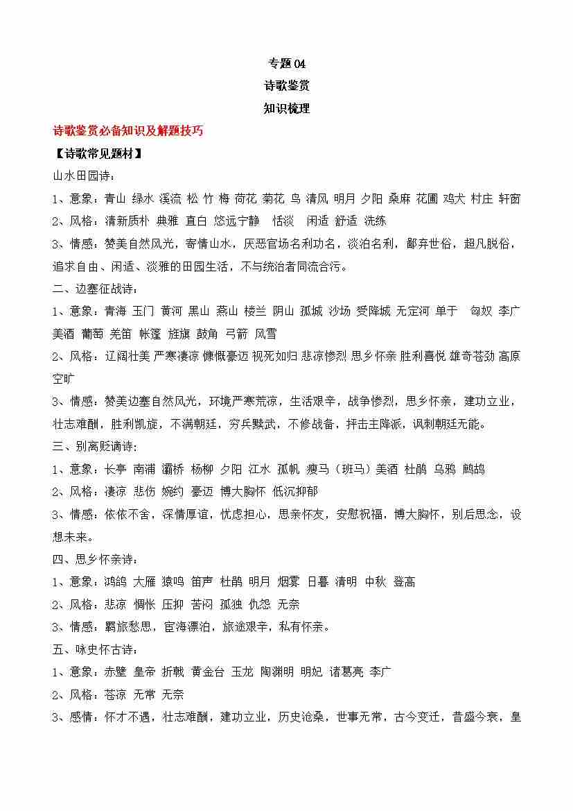期末专题04 诗歌鉴赏(知识梳理)-高一语文下学期期中期(统编版必修下册)