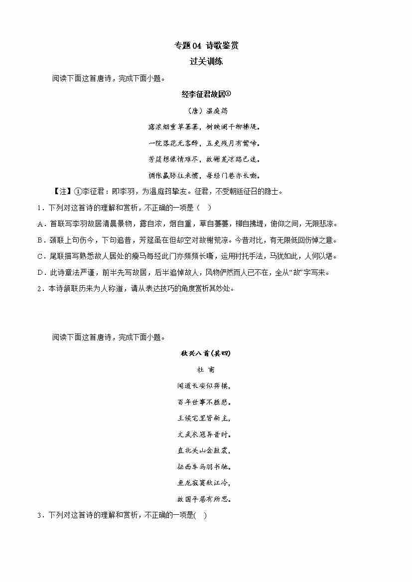 期末专题04 诗歌鉴赏(过关训练)-高一语文下学期期中期(统编版必修下册)学生版