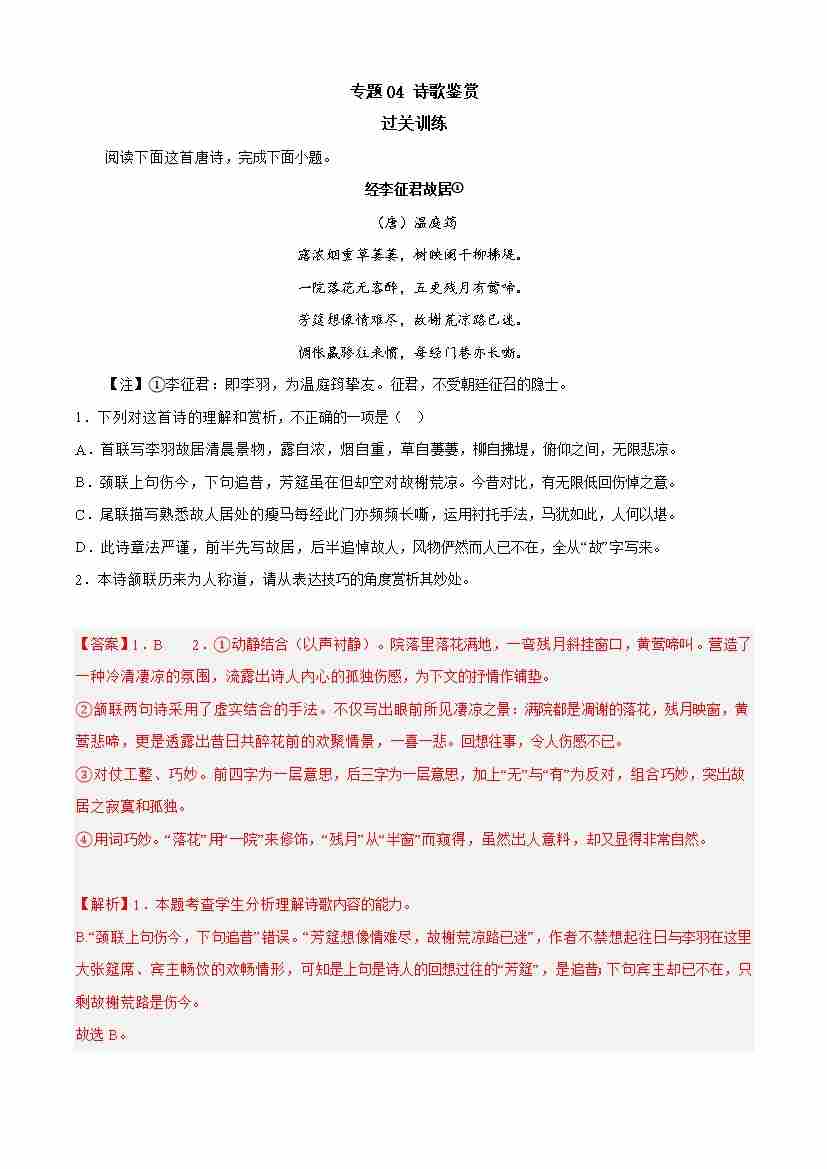 期末专题04 诗歌鉴赏(过关训练)-高一语文下学期期中期(统编版必修下册)教师版