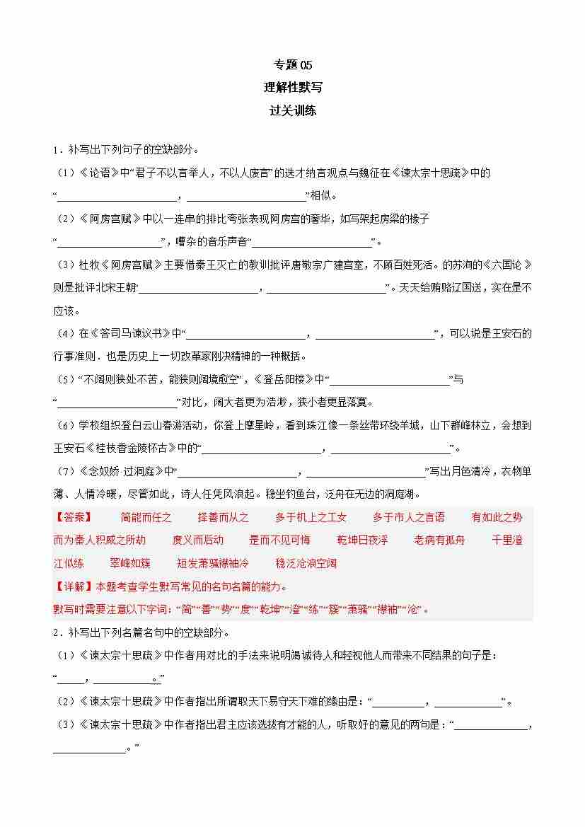 期末专题05 理解性默写(过关训练)-高一语文下学期期中期(统编版必修下册)教师版