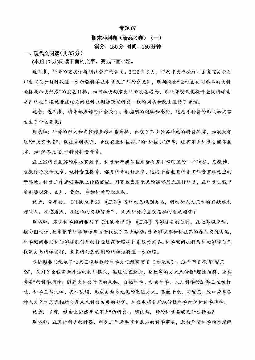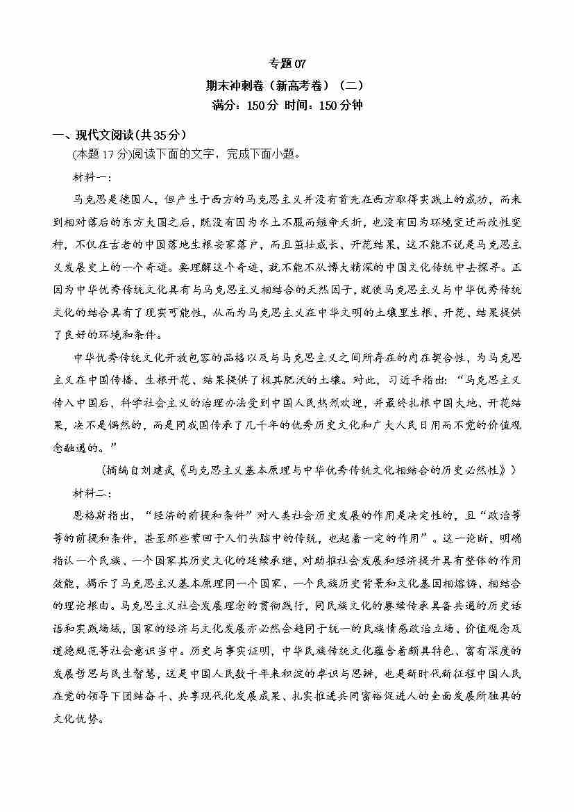 期末专题07 期末冲刺卷(新高考卷)(二)-高一语文下学期期中期(统编版必修下册)学生版