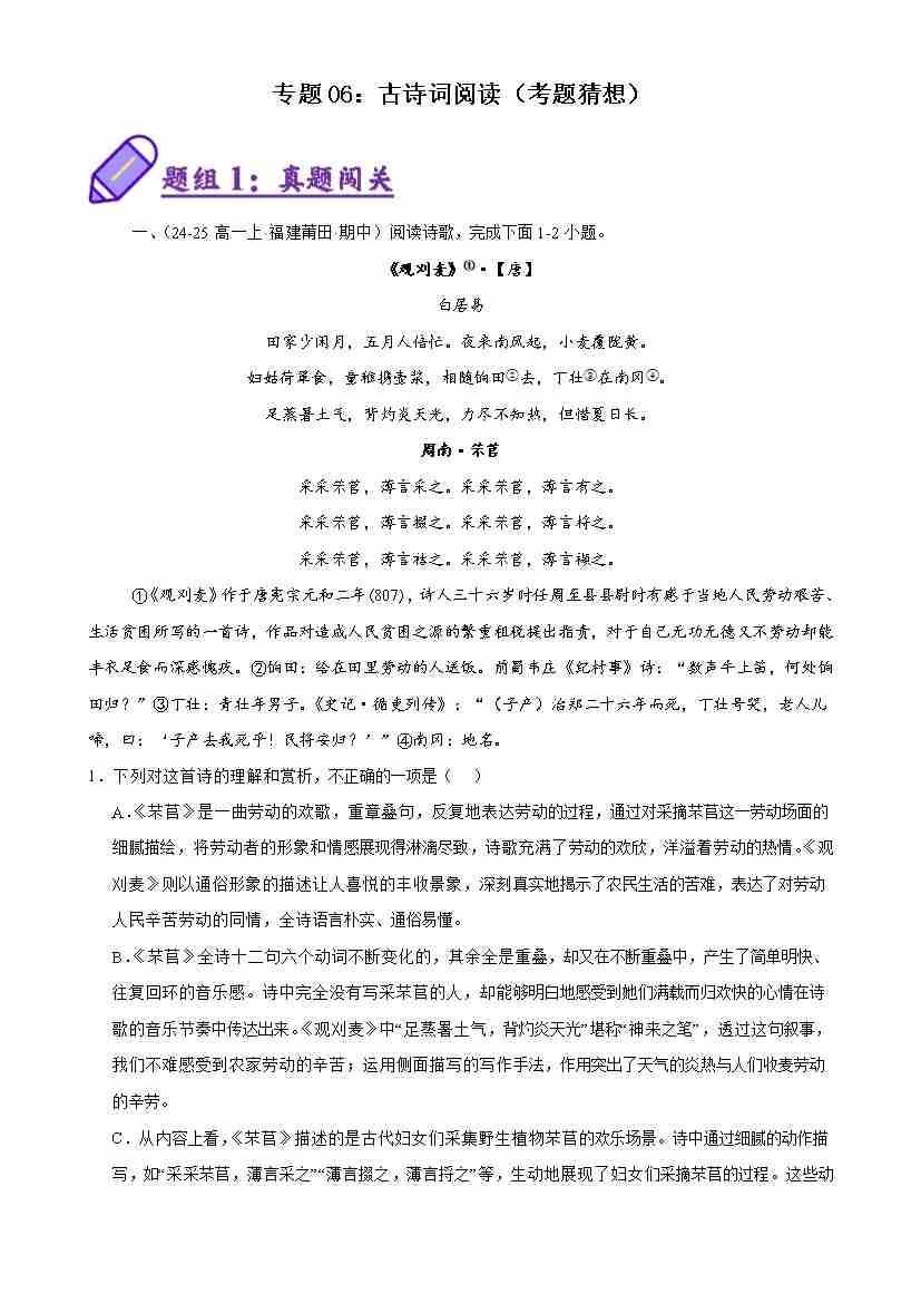 专题06:古诗词阅读(考题猜想)(学生版)