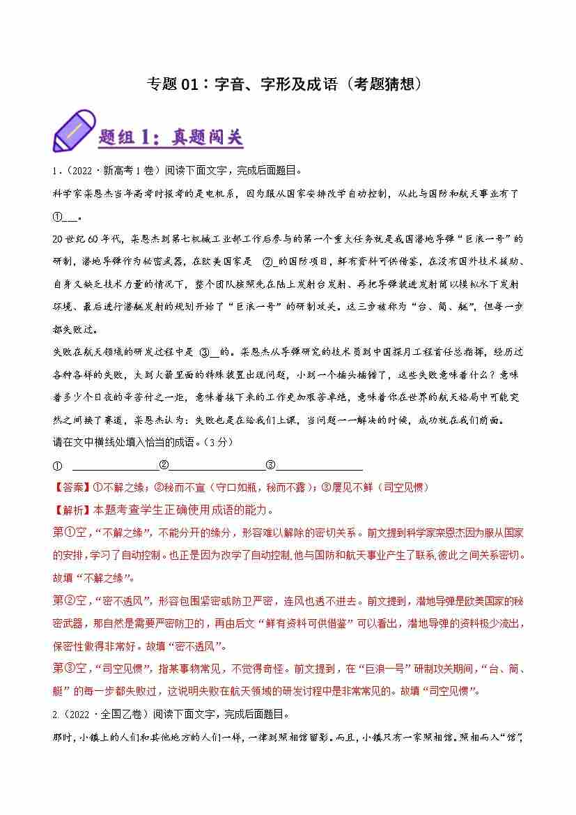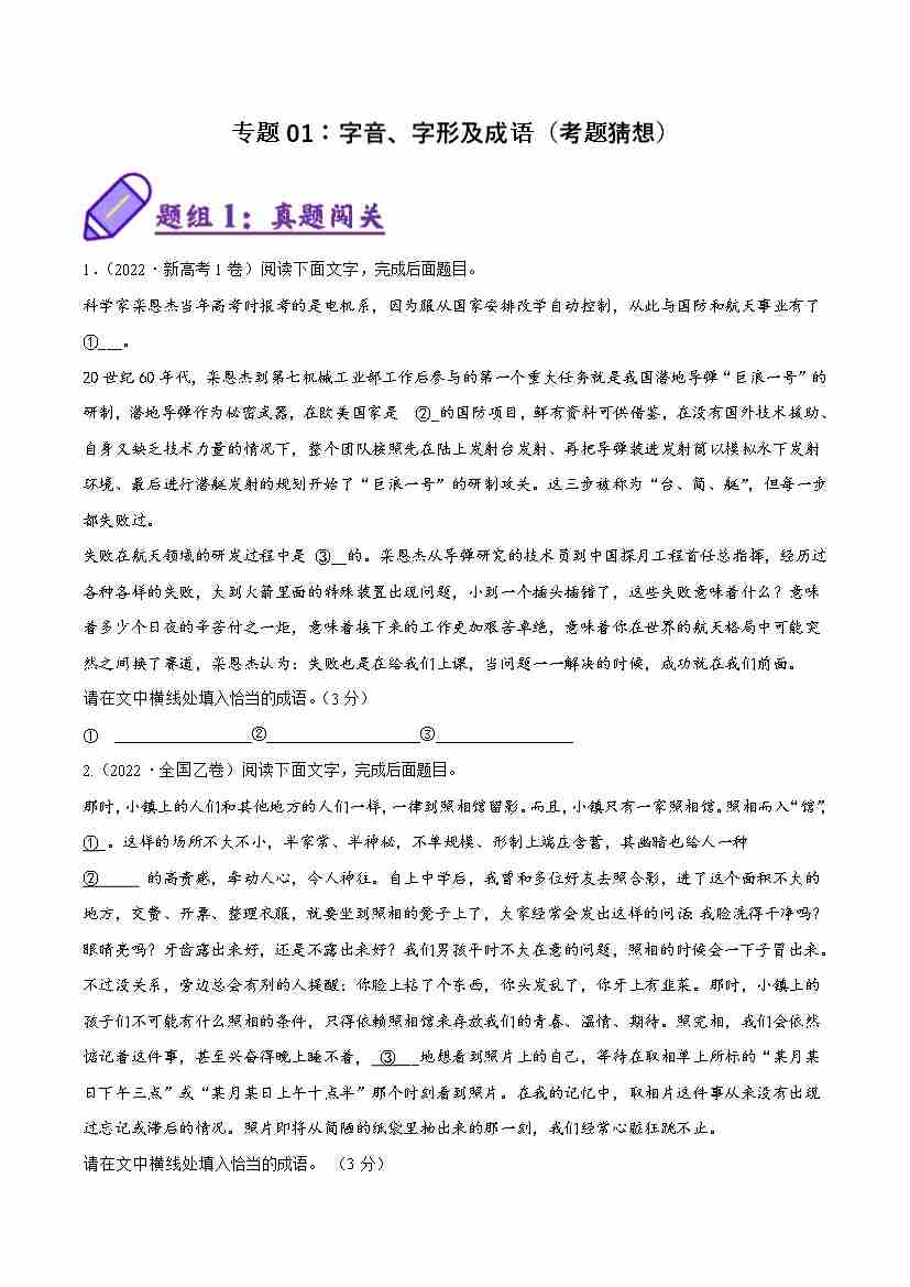 专题01:字音、字形成语(考题猜想)(学生版)