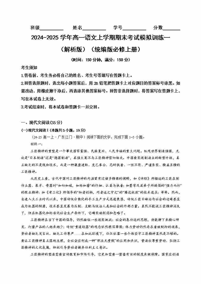 高一语文上学期期末考试模拟训练一(教师版)(统编版必修上册)