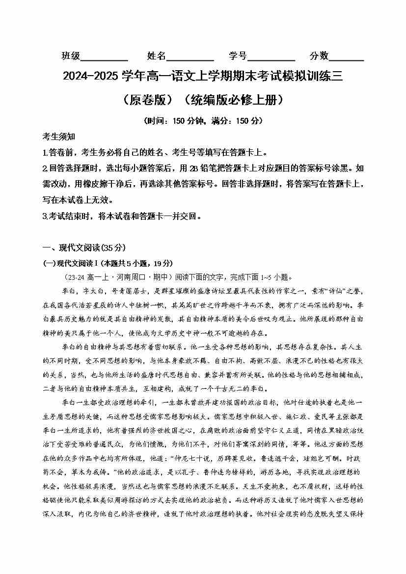 高一语文上学期期末考试模拟训练三(学生版)(统编版必修上册)