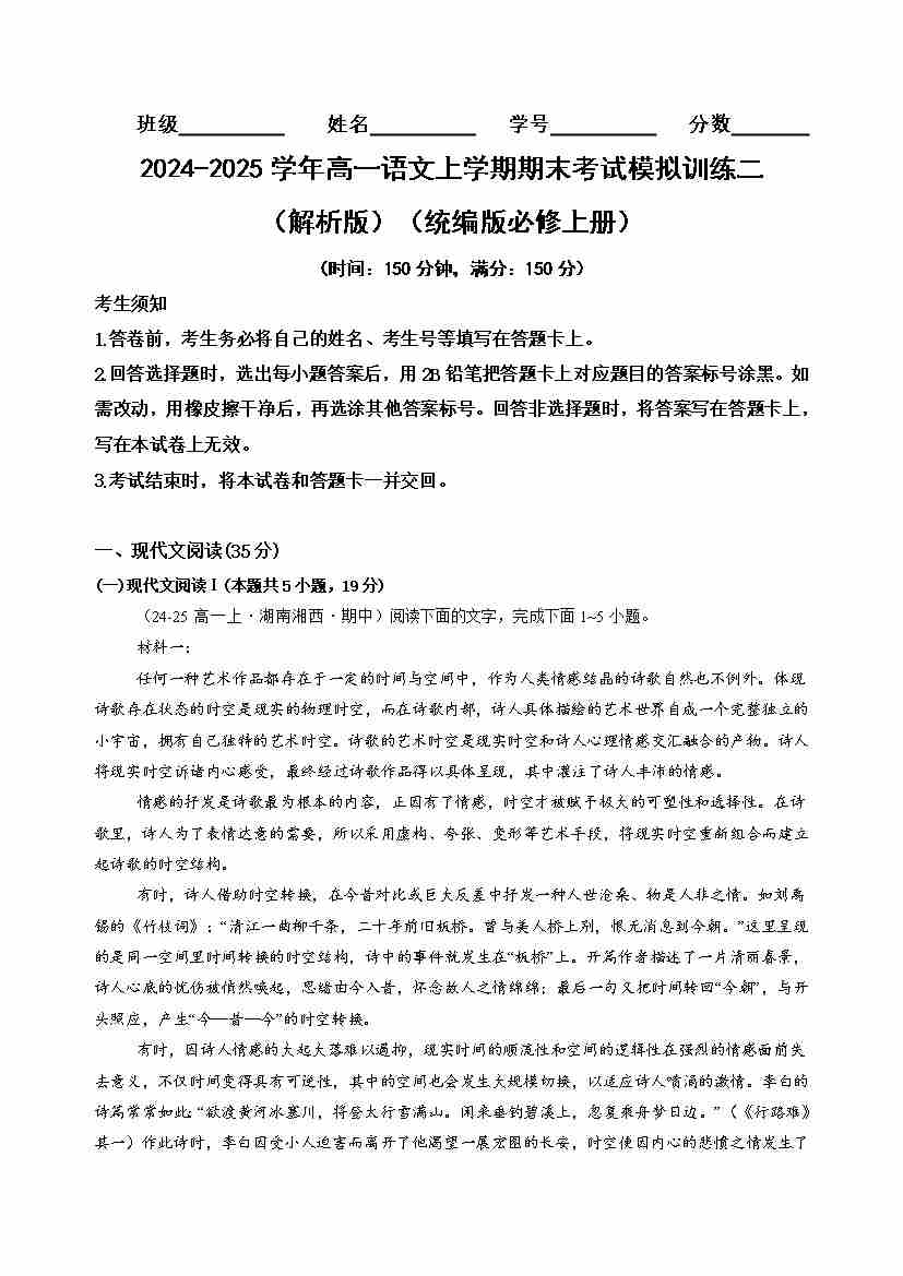 高一语文上学期期末考试模拟训练二(学生版)(统编版必修上册)