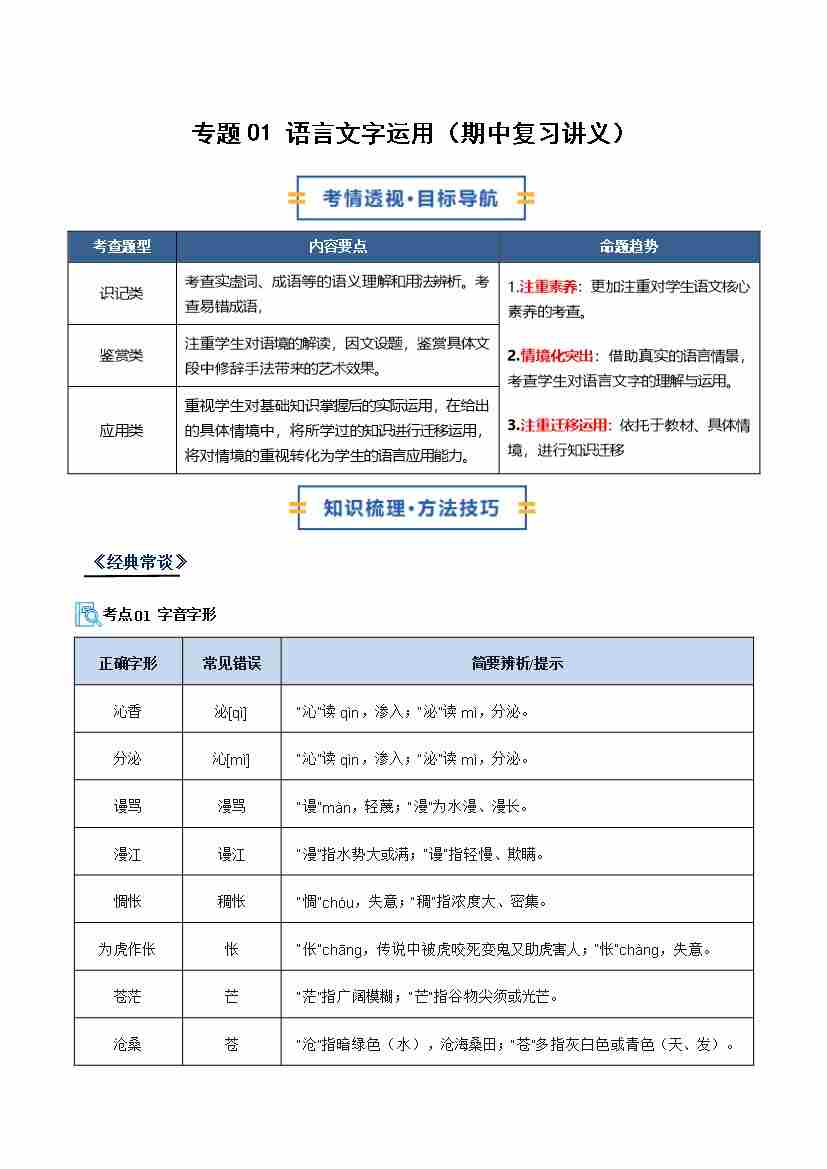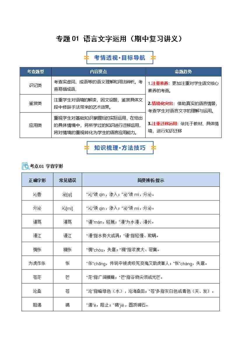 专题01 语言文字运用(期中复习讲义)(学生版)