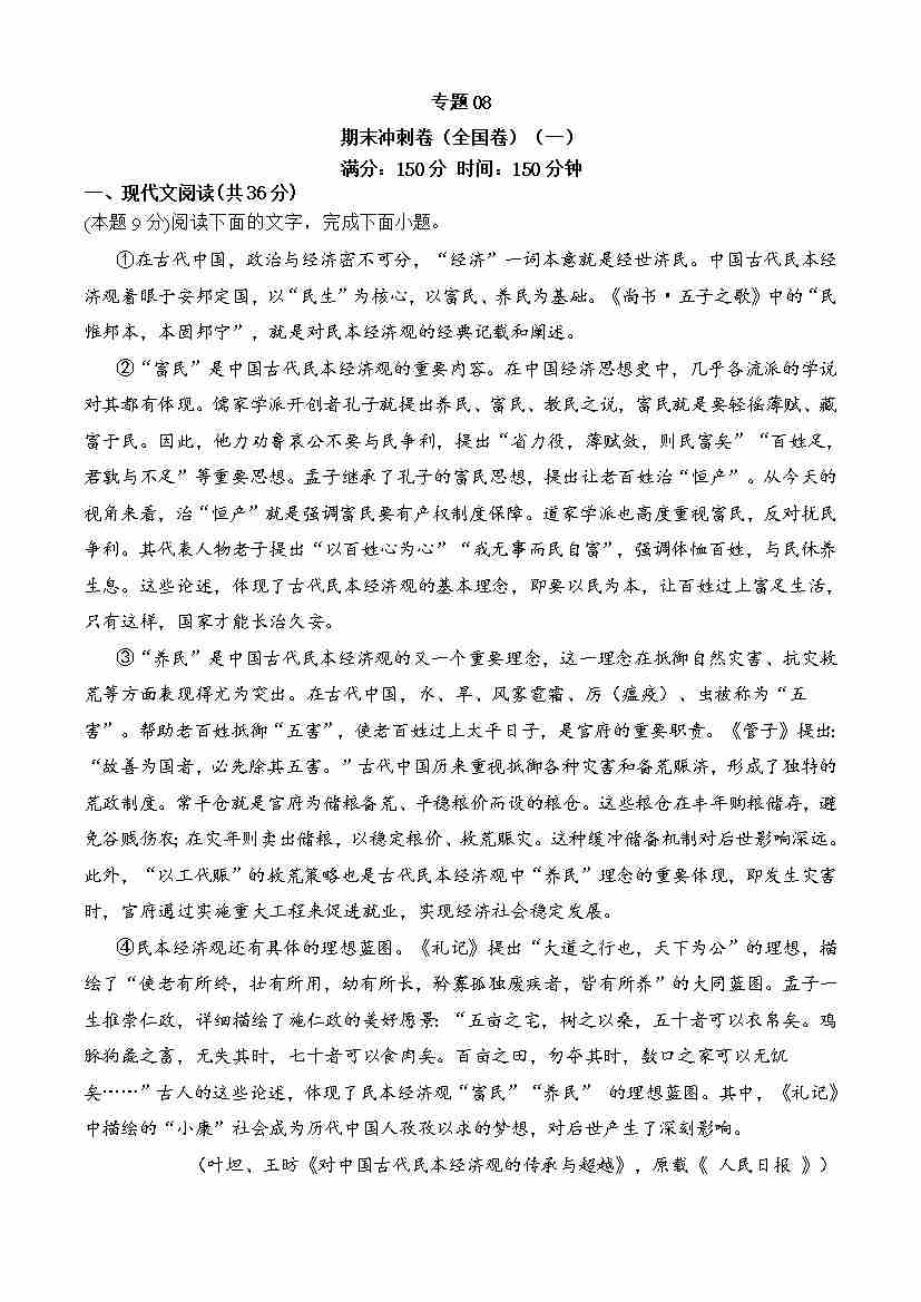 专题08 期末冲刺卷(全国卷)(一)-高一语文上学期期中期(必修上册)学生版