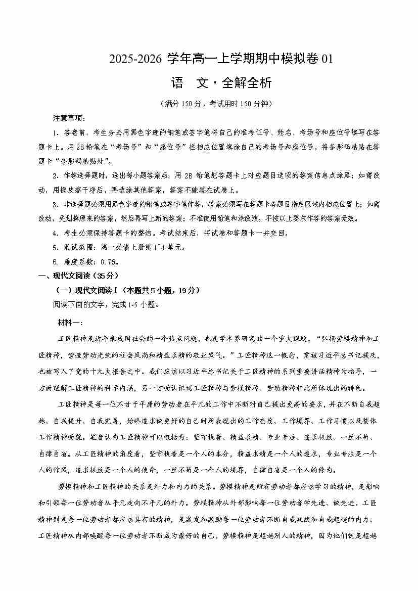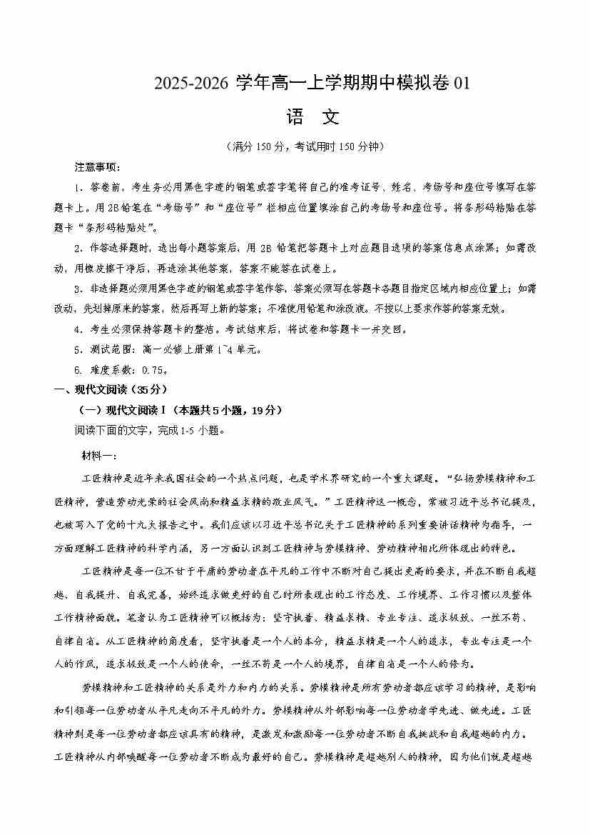 高一语文上学期期中模拟卷01(统编版)(考试版A4)