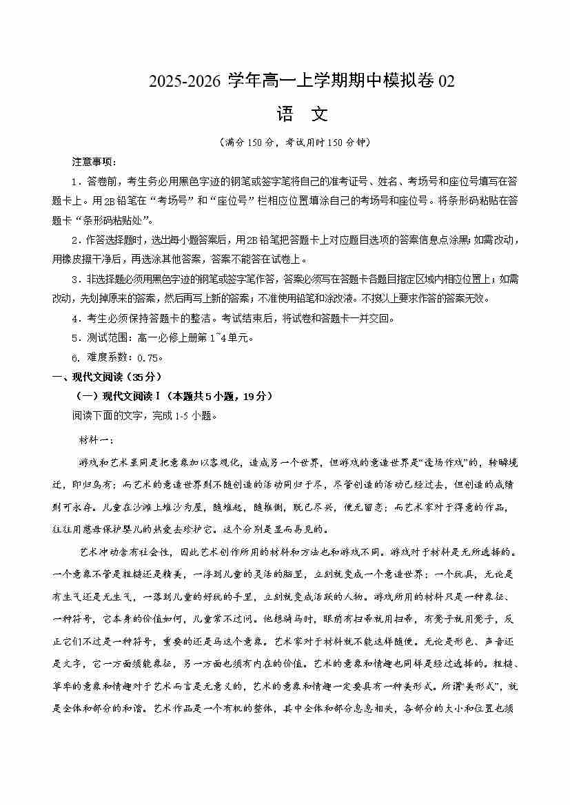 高一语文上学期期中模拟卷02(统编版)(考试版A4)