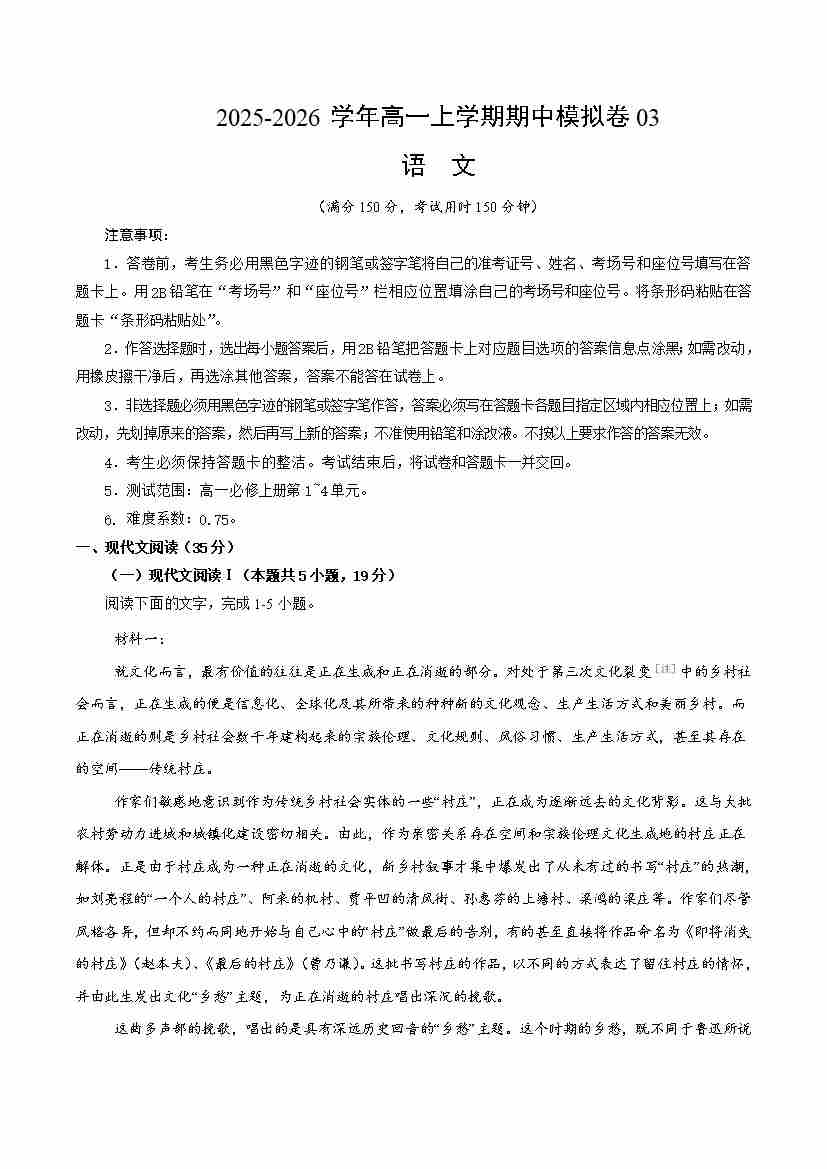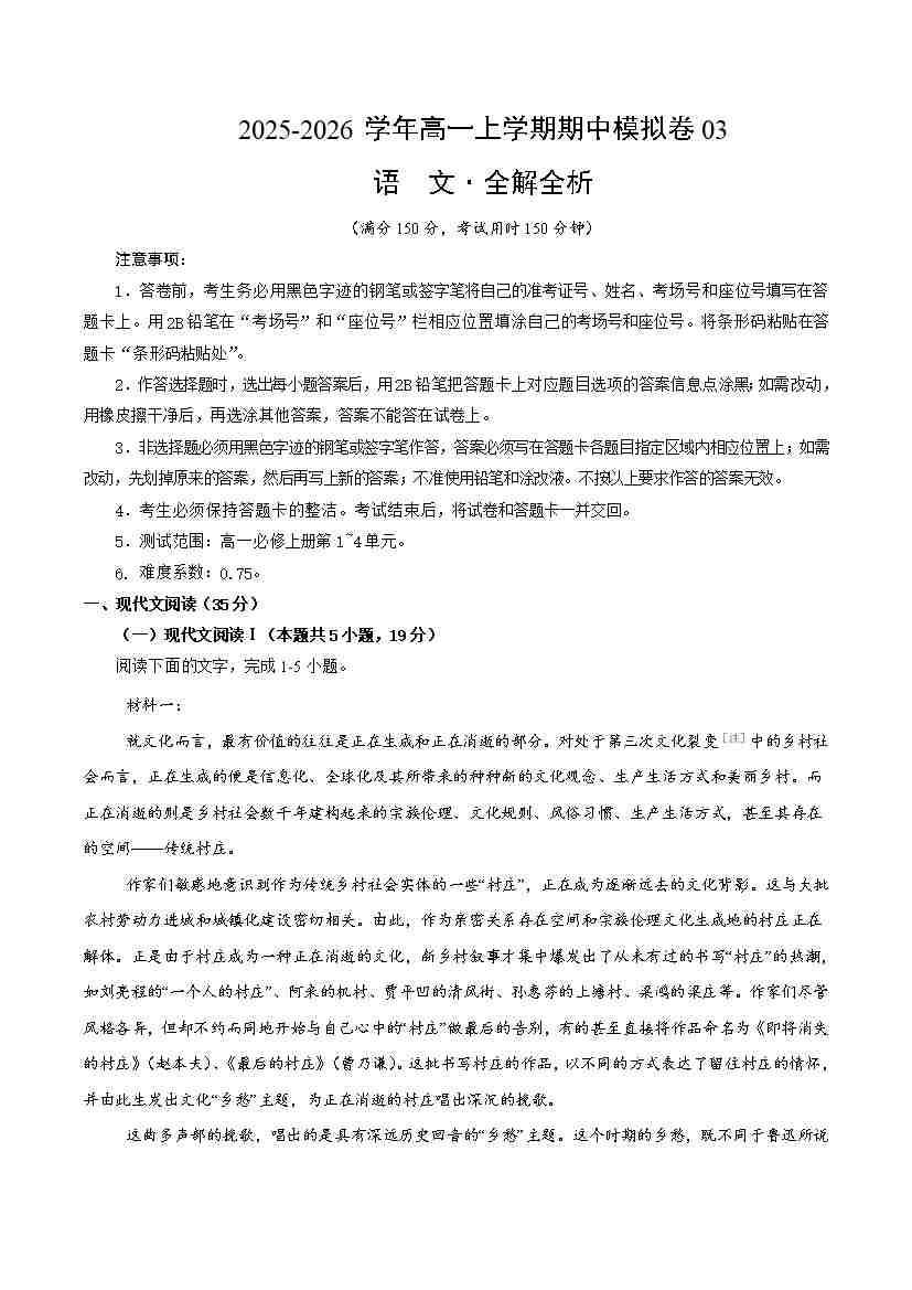 高一语文上学期期中模拟卷03(统编版)(考试版A4)