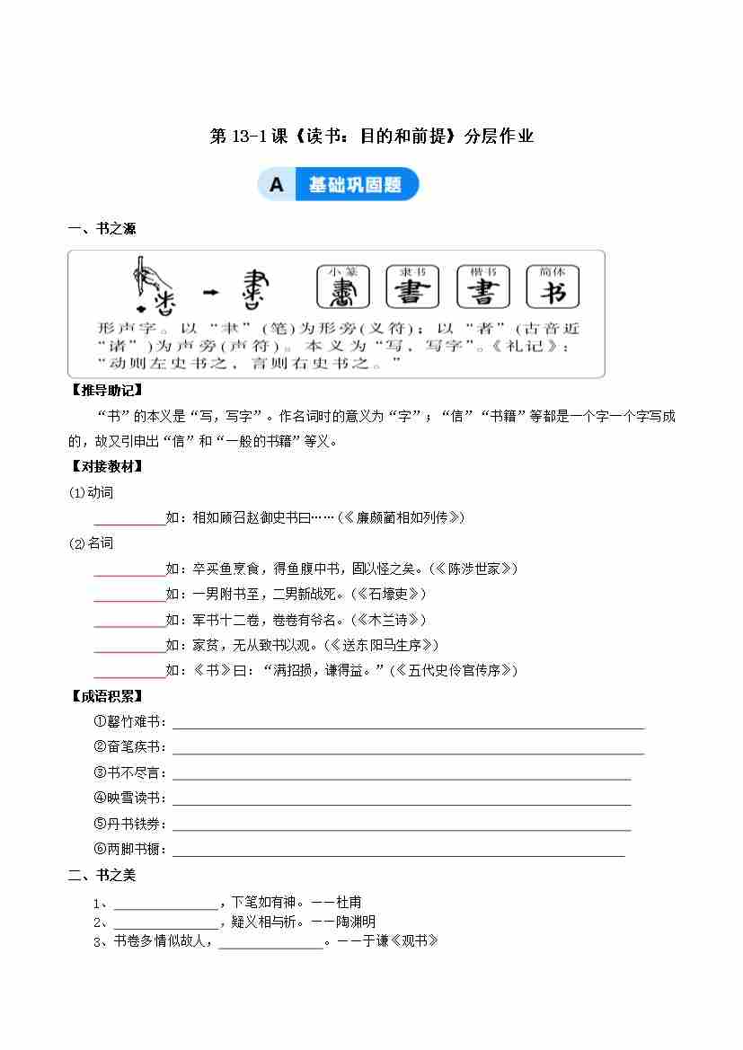 13-1《读书:目的和前提》:悟学习之道 获教养之径(主题任务式分层作业)(原卷版)