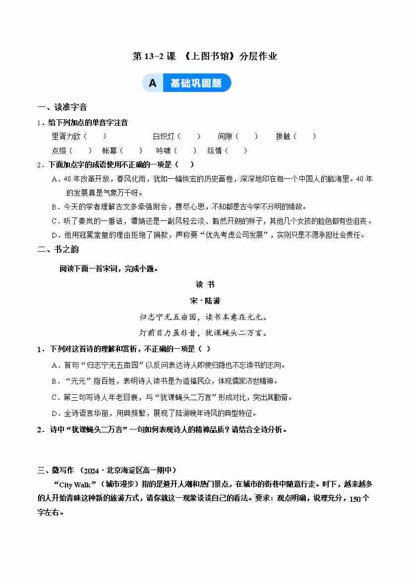 13-2《上图书馆》:悟学习之道享读书之乐(主题任务式分层作业)(原卷版)
