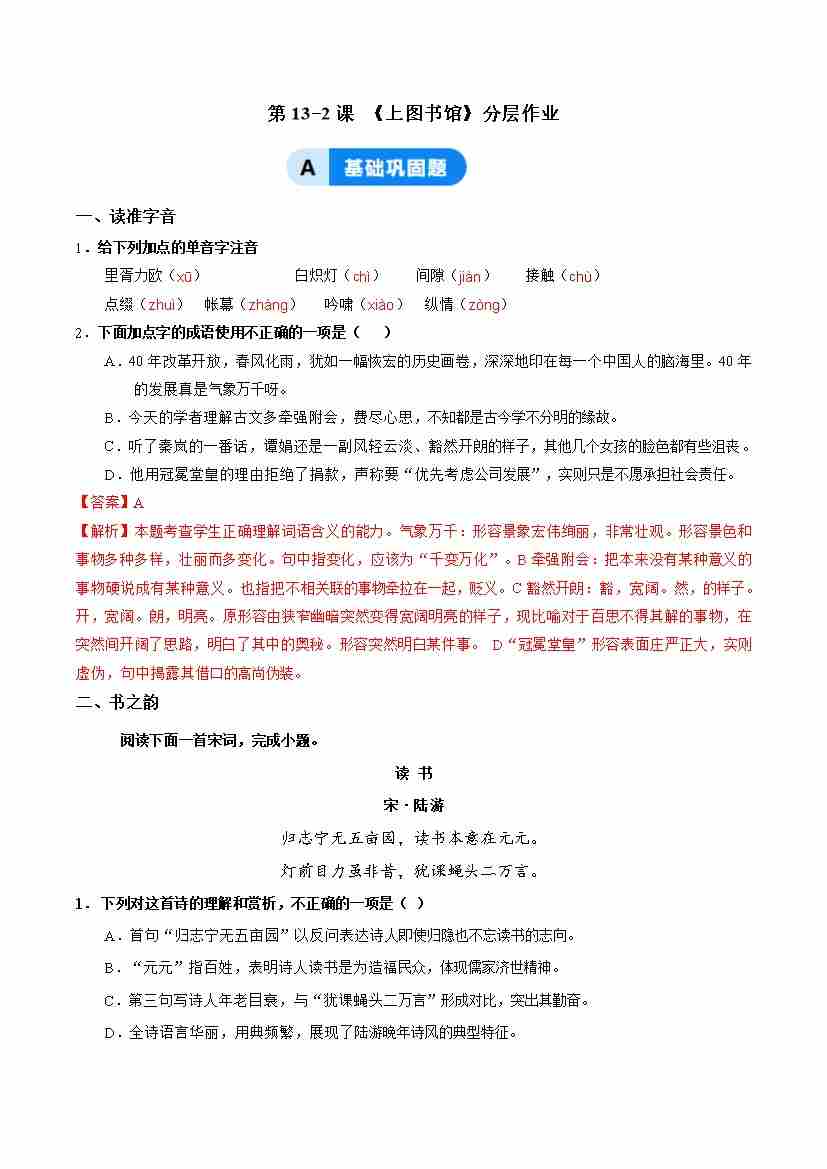13-2《上图书馆》:悟学习之道享读书之乐(主题任务式分层作业)(解析版)