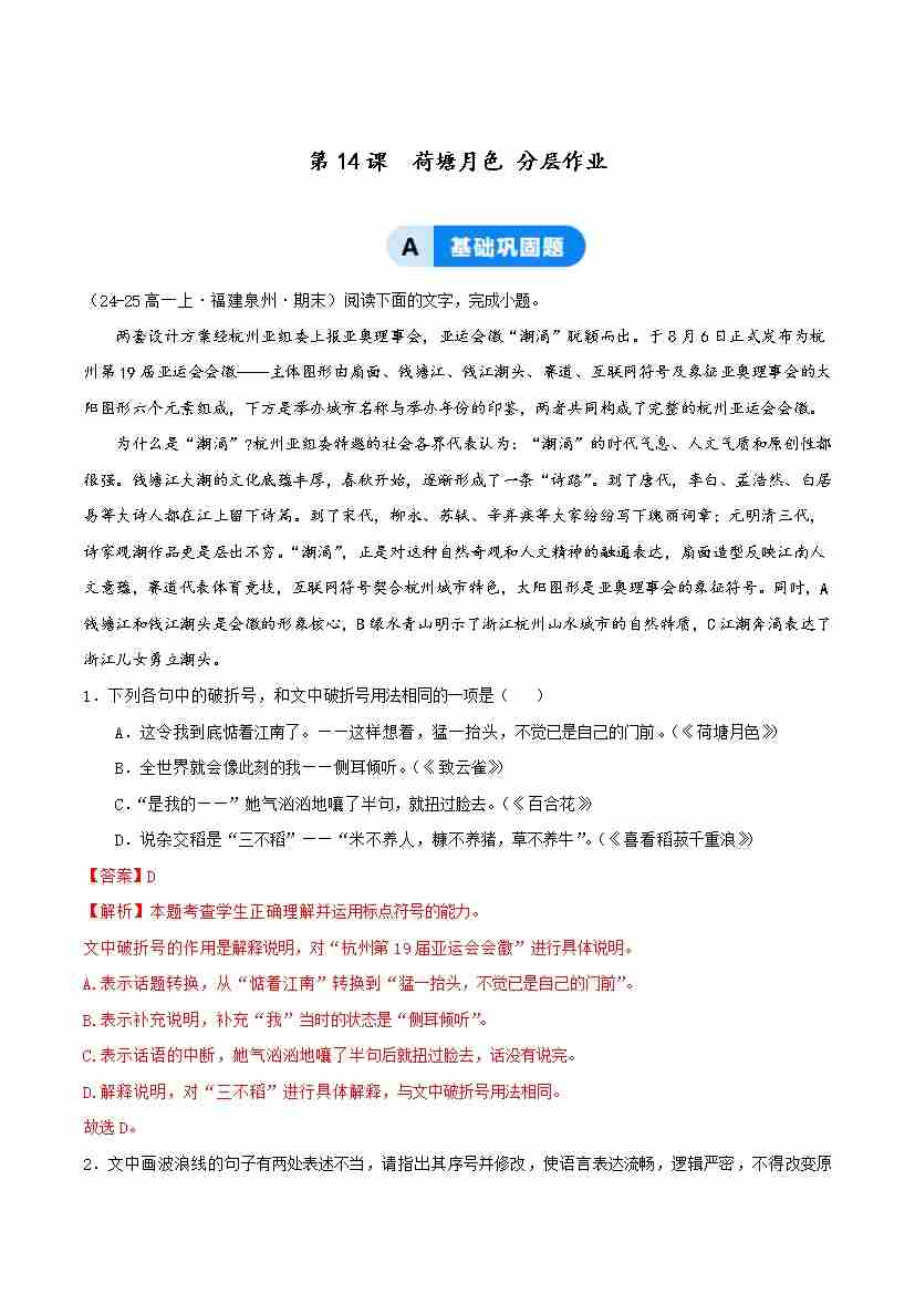 14-2 荷塘月色(主题任务分层作业)(解析版)