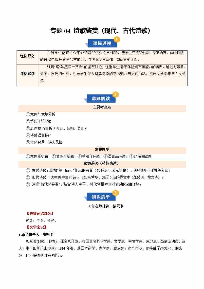 专题04 诗歌鉴赏(现代、古代诗歌)(期中知识清单)