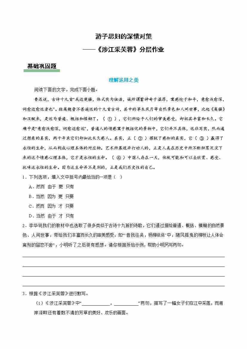 涉江采芙蓉:游子思妇的深情对望(主题任务分层作业)(原卷版)