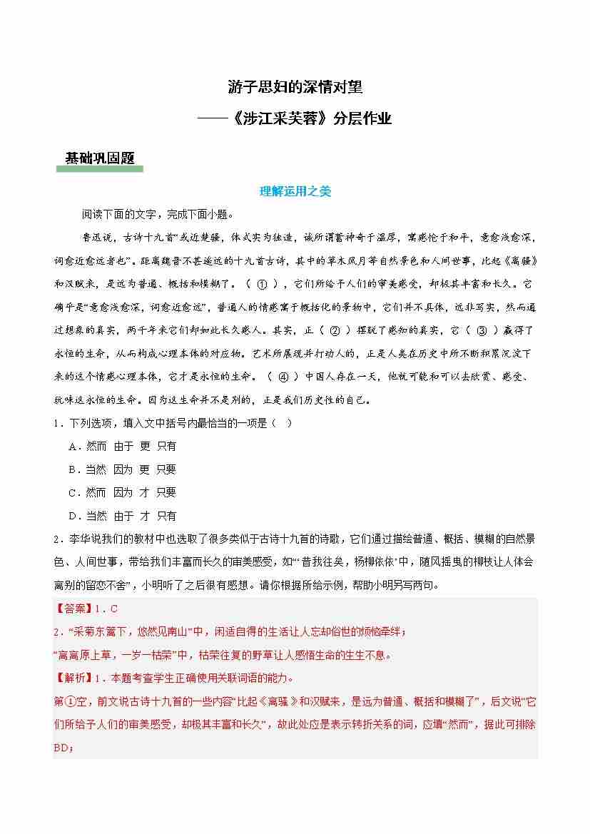 涉江采芙蓉:游子思妇的深情对望(主题任务分层作业)(解析版)
