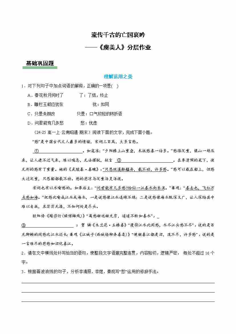 虞美人:流传千古的亡国哀吟(主题任务分层作业)(原卷版)