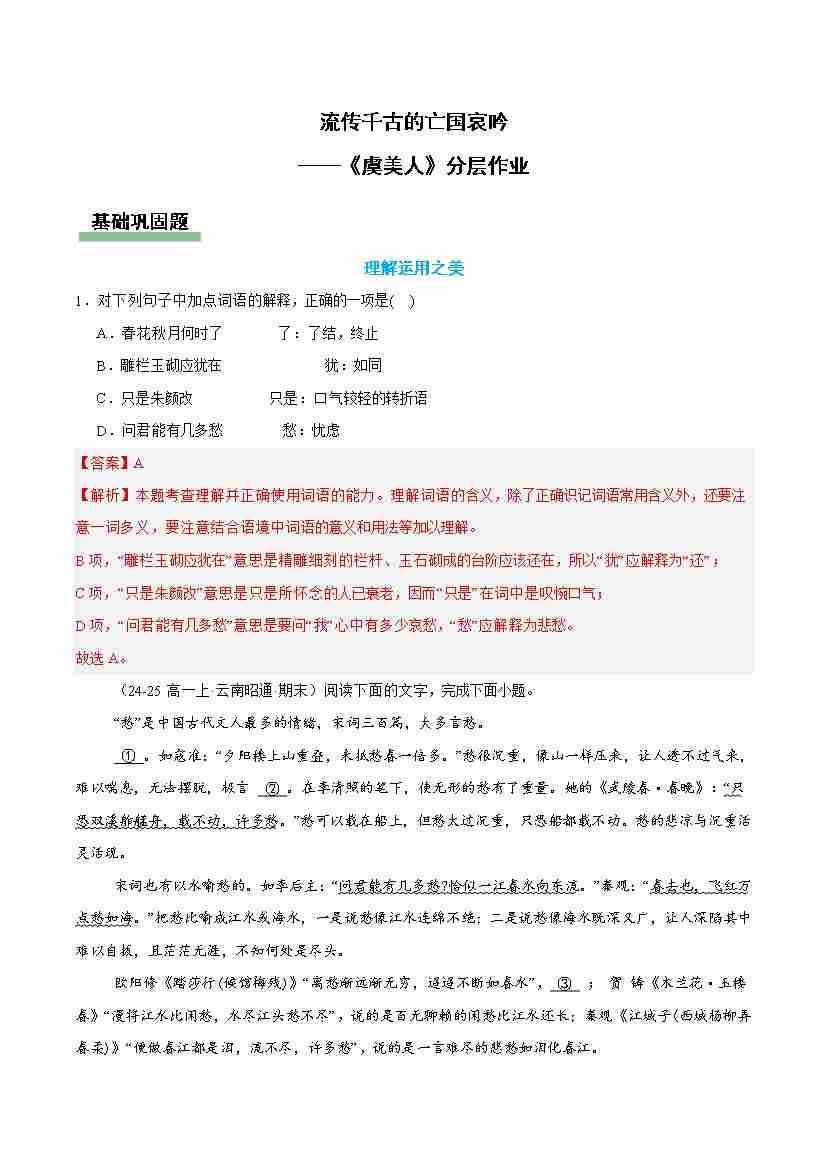虞美人:流传千古的亡国哀吟(主题任务分层作业)(解析版)