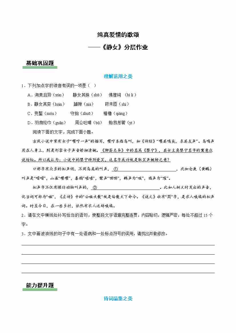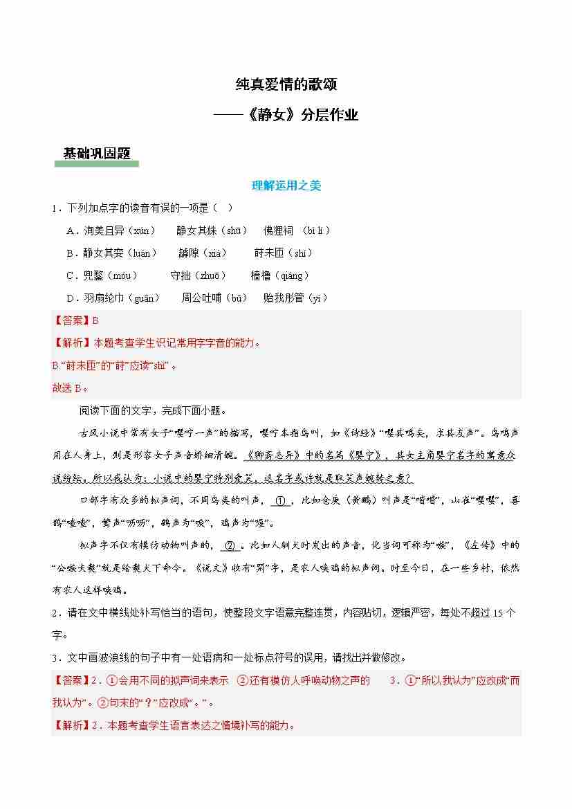 静女: 纯真爱情的歌颂(主题任务分层作业)(解析版)