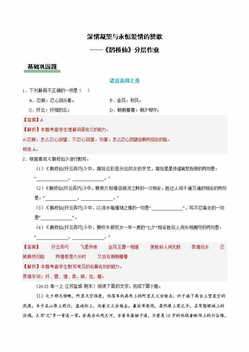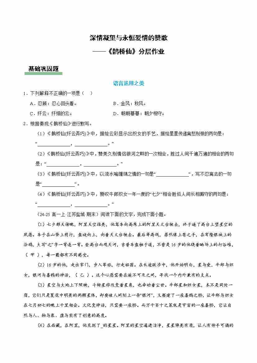 鹊桥仙:深情凝望与永恒爱情的赞歌(主题任务分层作业)(原卷版)