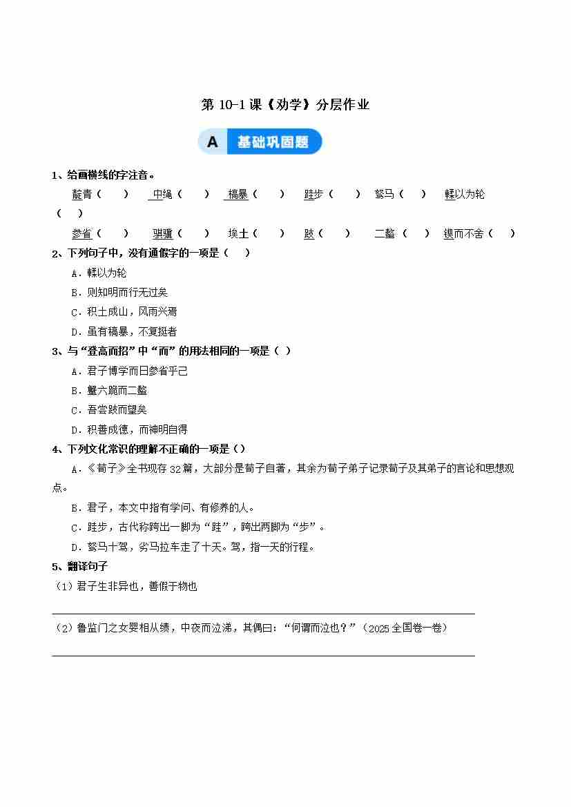 10-1《劝学》:悟学习之道 闻圣贤之训(主题任务式分层作业)(原卷版)