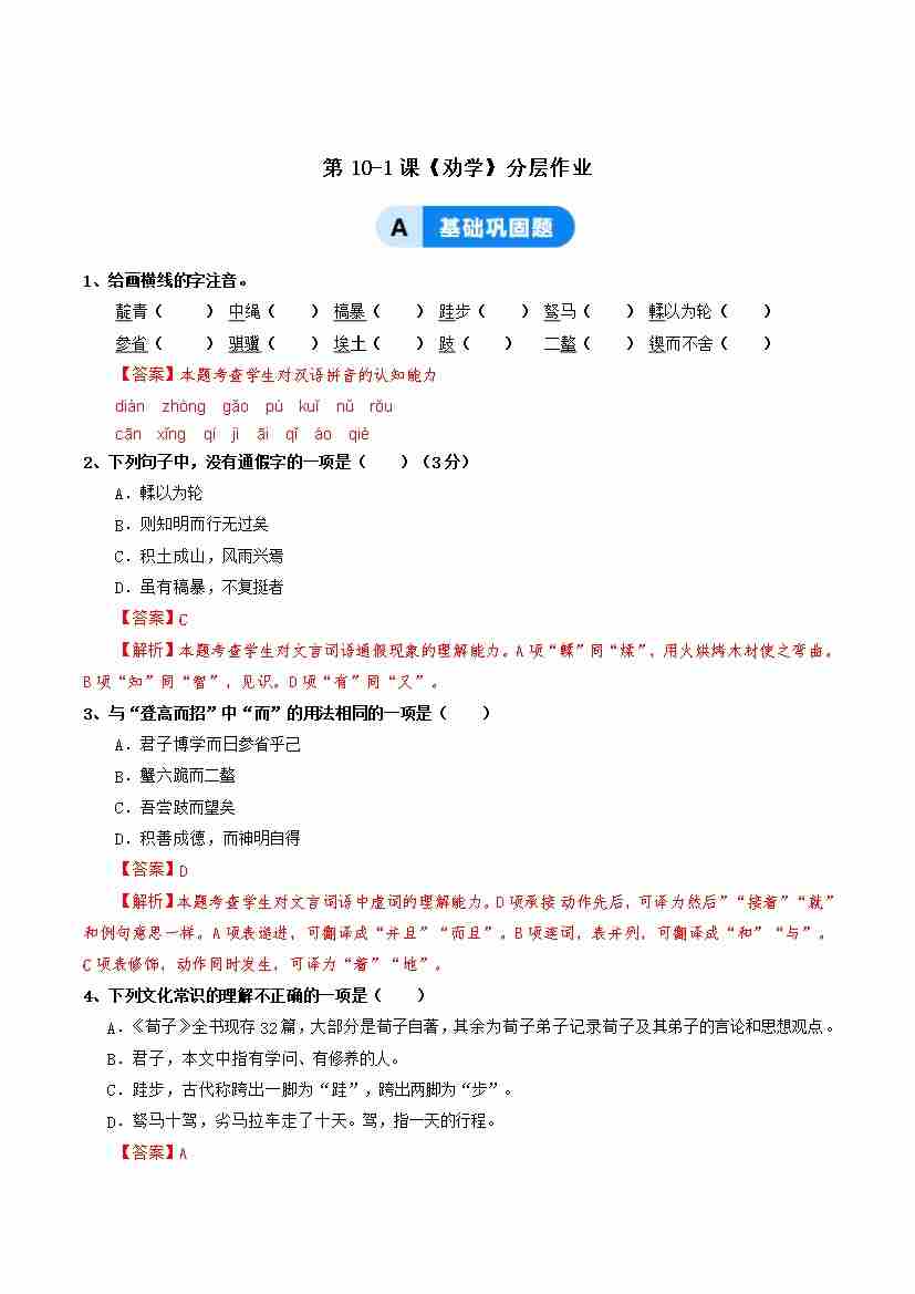 10-1《劝学》:悟学习之道 闻圣贤之训(主题任务式分层作业)(解析版)