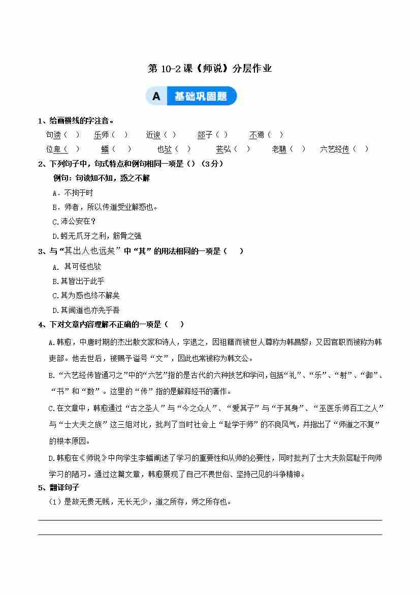 10-2《师说》:悟学习之道 修尊师之心(主题任务式分层作业)(原卷版)