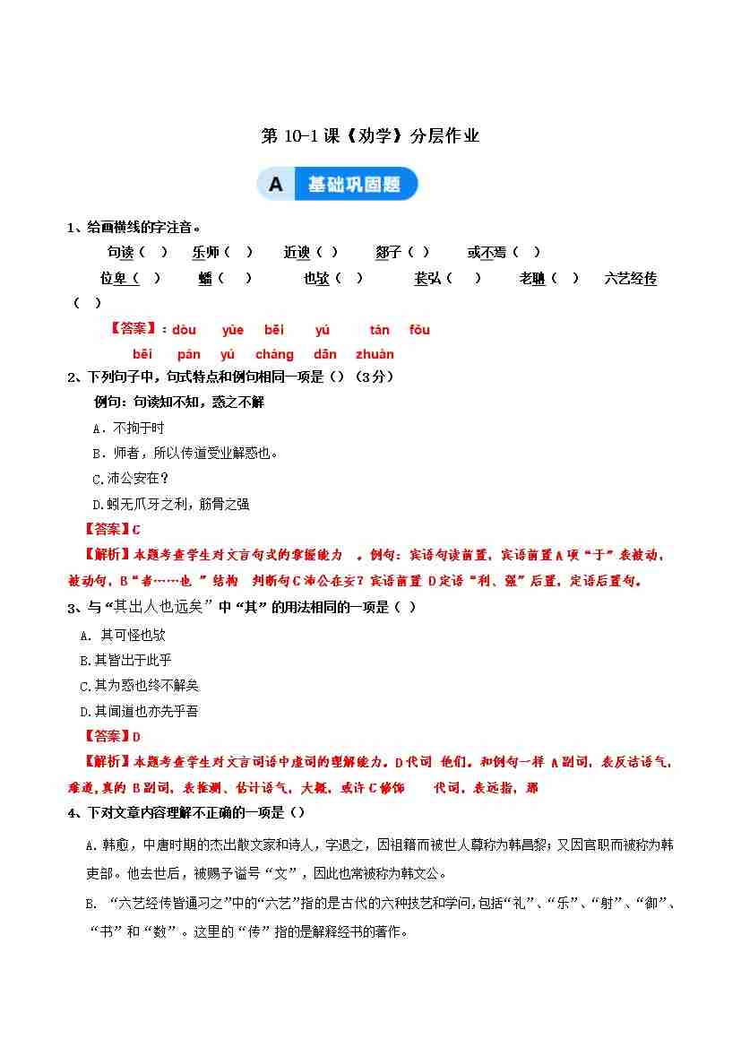 10-2《师说》:悟学习之道 修尊师之心(主题任务式分层作业)(解析版)