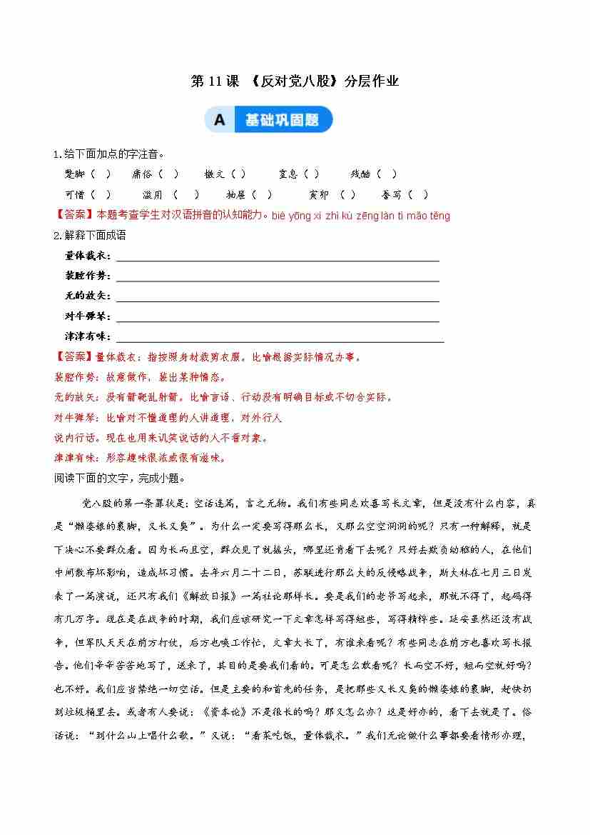 11《反对党八股》(分层作业)(解析版)