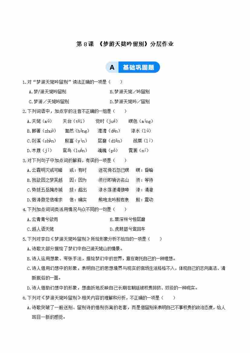 8-1 梦游天姥吟留别:梦游中的生命突围与诗意栖居(主题任务式分层作业)(原卷版)