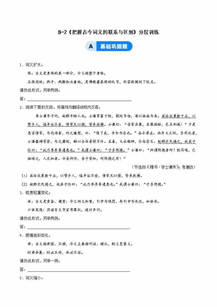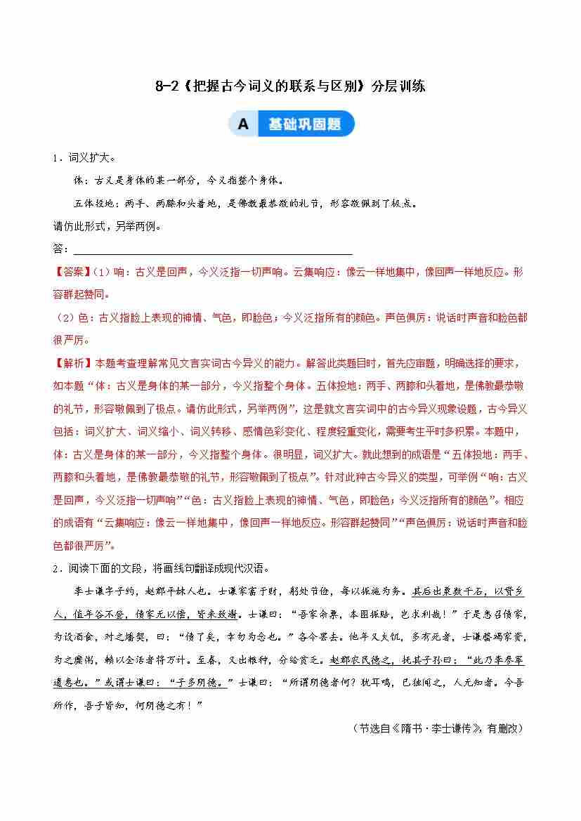 8-2 把握古今词义的联系与区别:训诂探幽明嬗变,词林筑桥贯古今(主题任务式分层作业)(解析版)