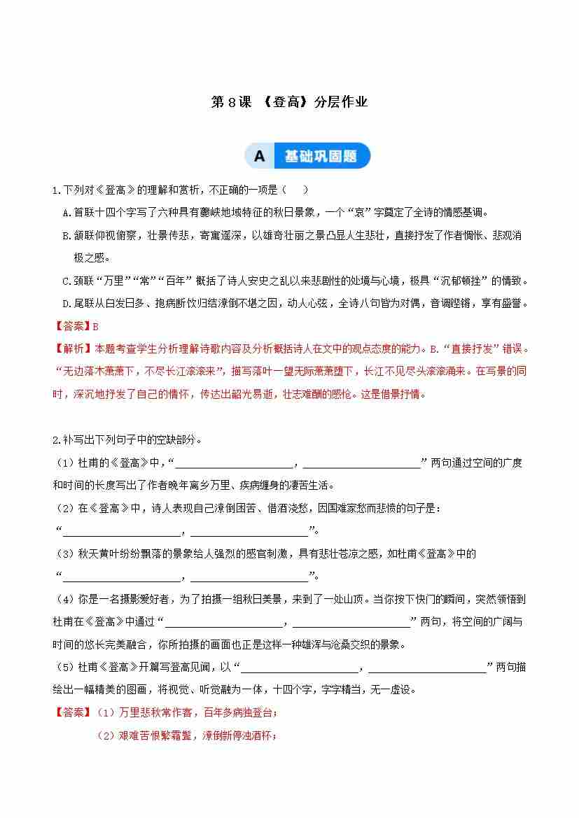 8-2 登高:秋江孤影里的生命重量(主题任务式分层作业)(解析版)