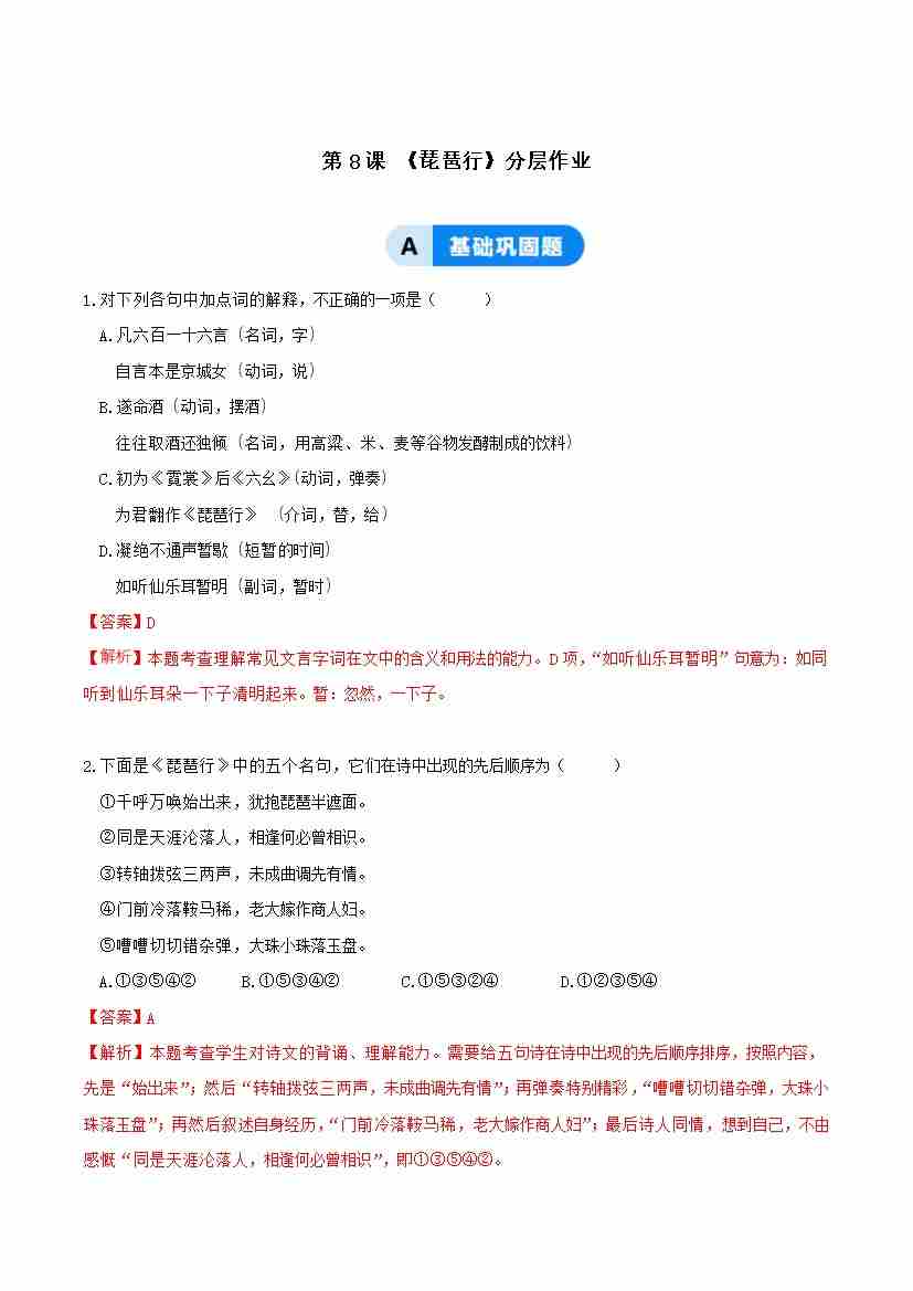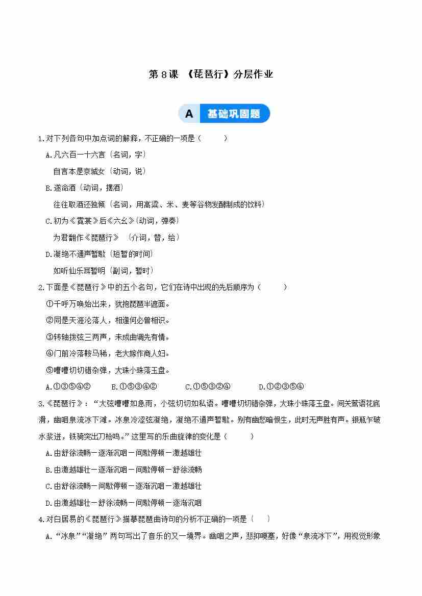 8-3 琵琶行:在苦难中寻得理解,在共鸣中照见生命(主题任务式分层作业)(解析版)