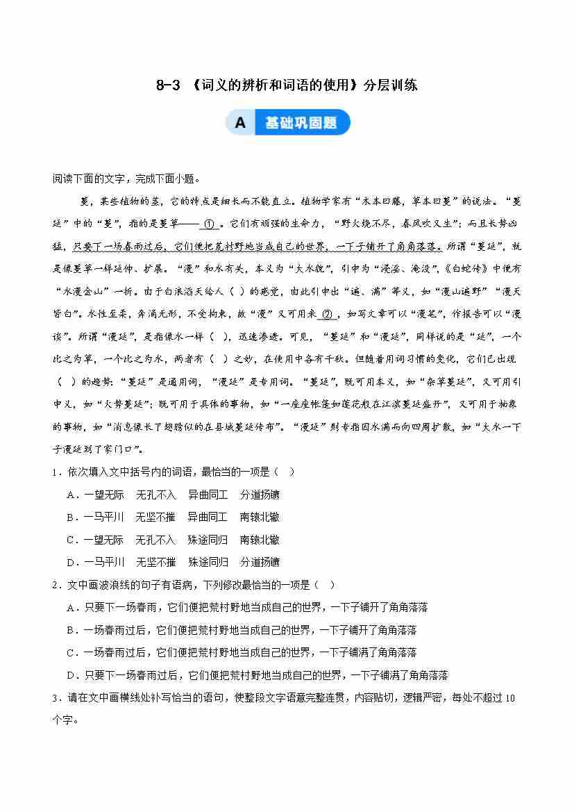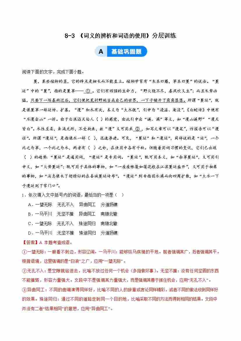 8-3 词义的辨析和词语的使用:探词义源流,践语用之道(主题任务式分层作业)(解析版)