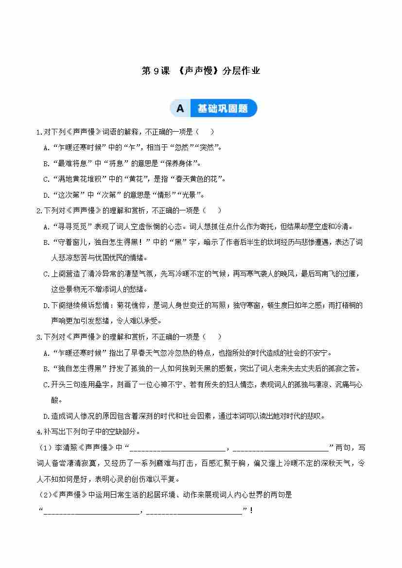 9-3 声声慢:乱世中的生命韧性(主题任务式分层作业)(原卷版)