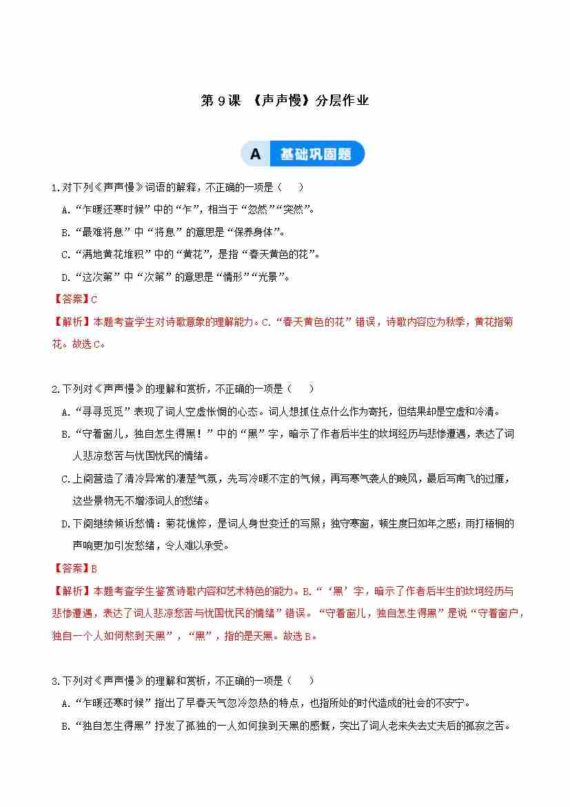 9-3 声声慢:乱世中的生命韧性(主题任务式分层作业)(解析版)