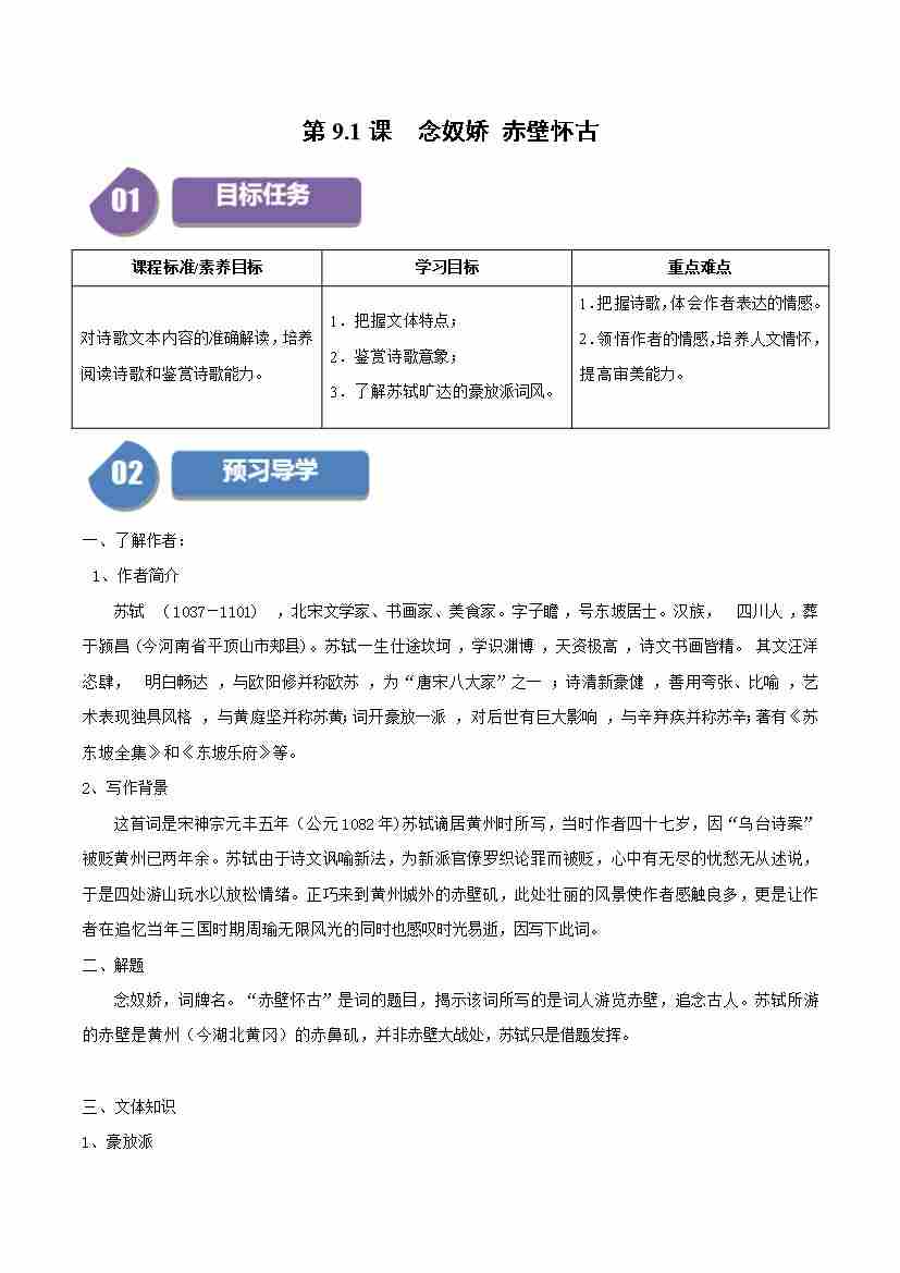 第9.1课 念奴娇 赤壁怀古(学生版)