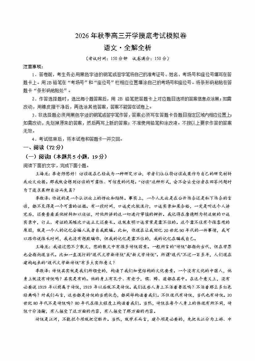 高三语文开学摸底考(全解全析)广东用专