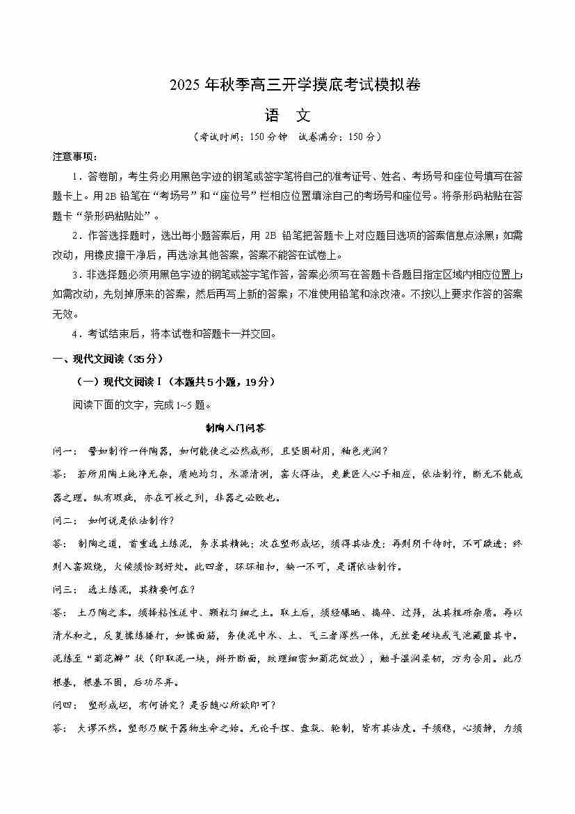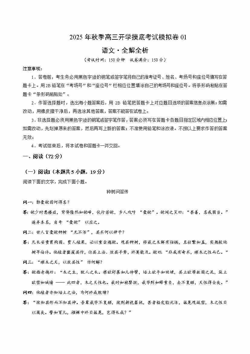 高三语文开学摸底考01(考试版A4)全国二卷通用