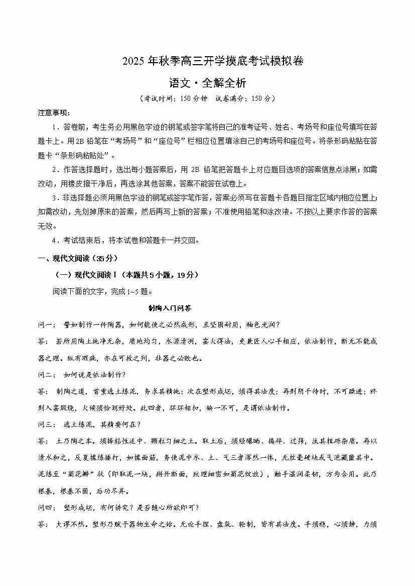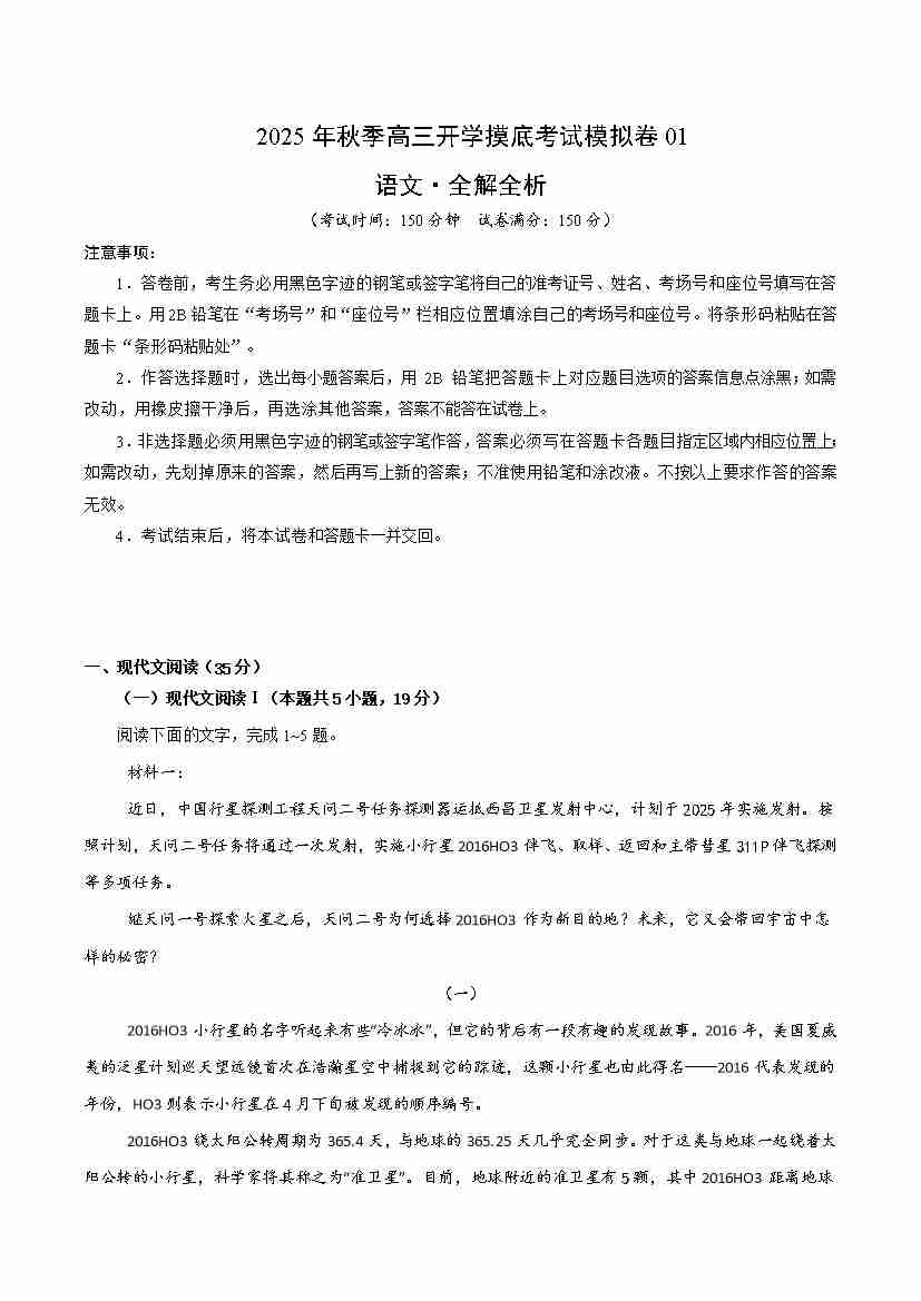 高三语文开学摸底考01(全解全析)全国一卷通用