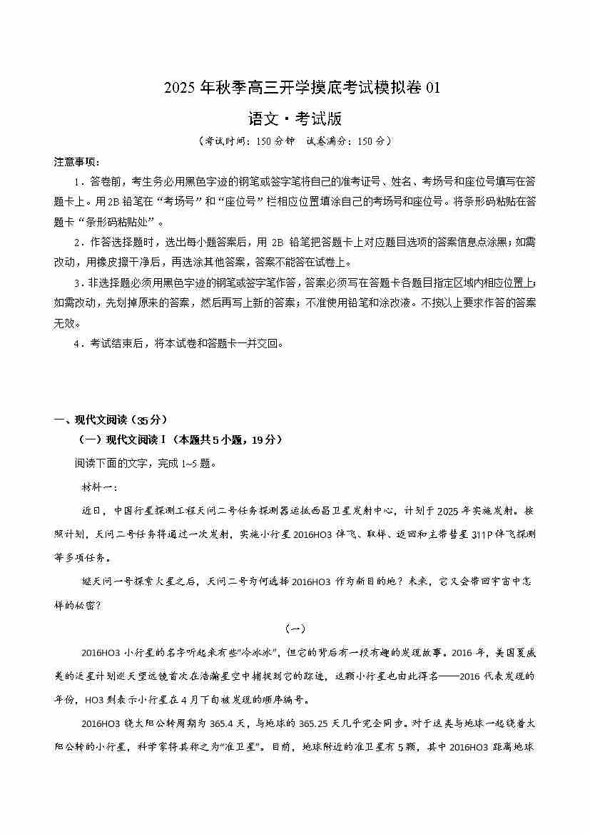 高三语文开学摸底考01(考试版A4)全国一卷通用