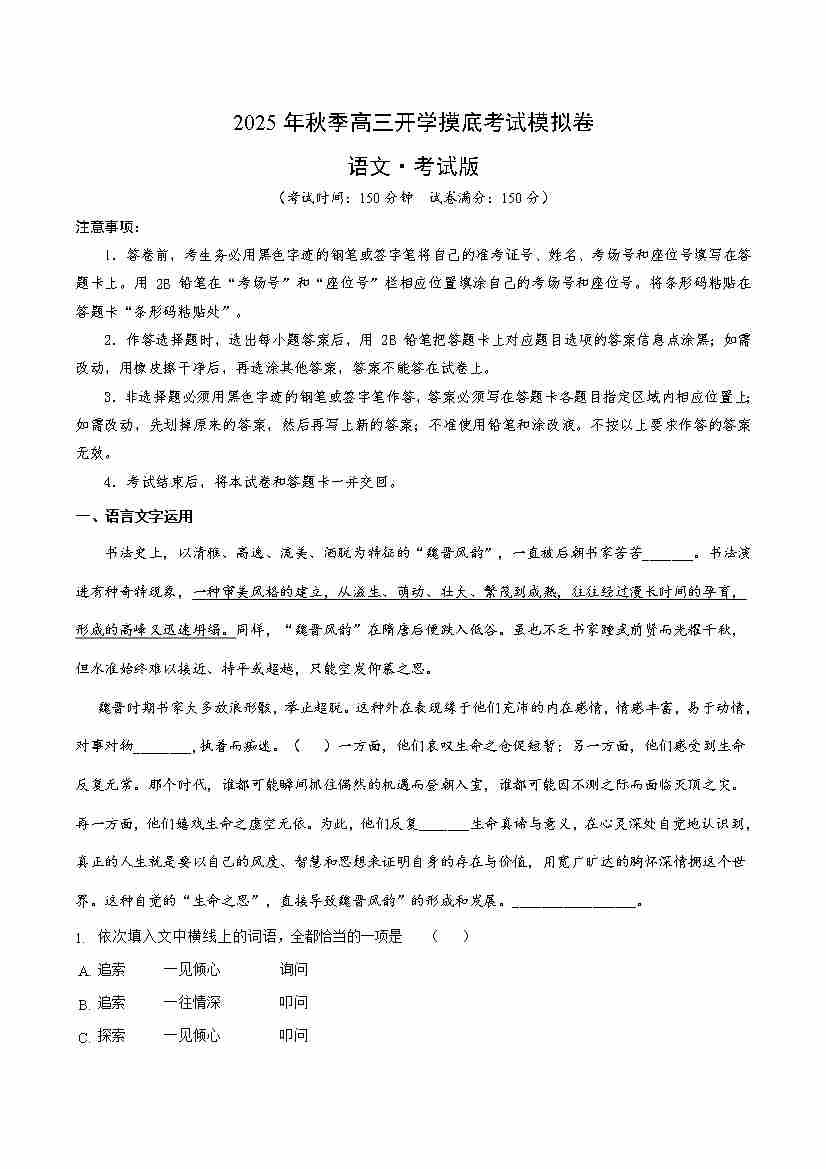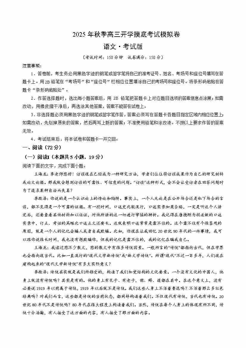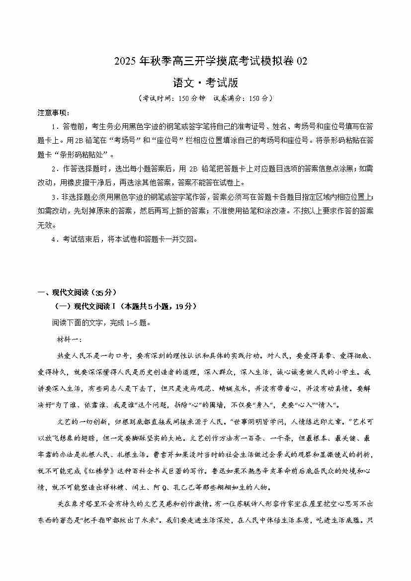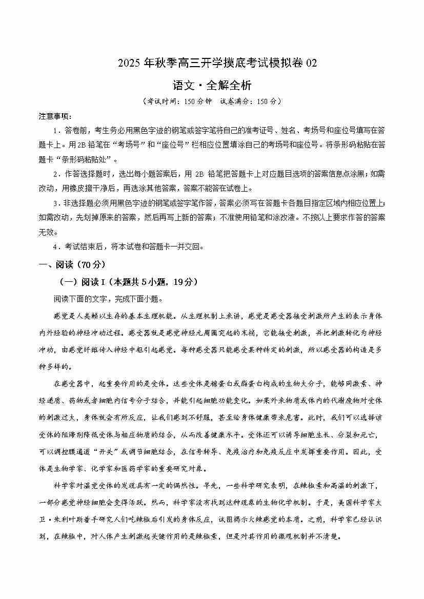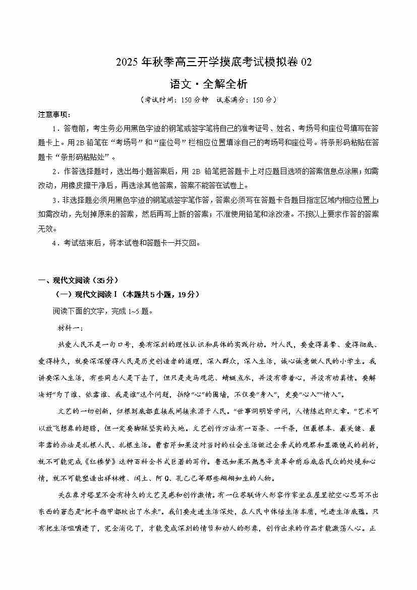高三语文开学摸底考02(考试版A4)全国一卷通用